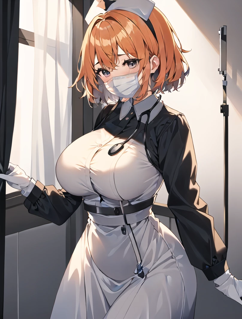 longnurset2, gloves, surgical mask, nurse, nurse cap, stethoscope,puffy dress,long sleeves,long dress