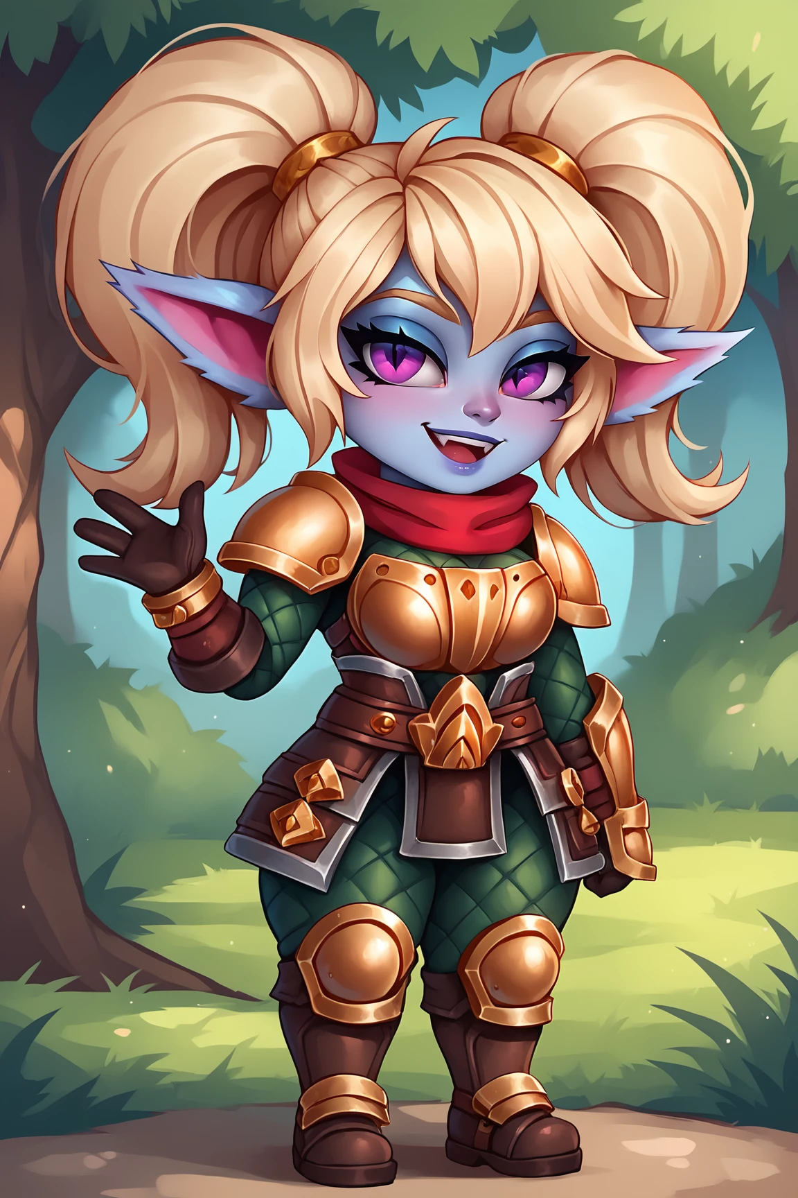 PoppyLoLXLv2, blue skin, colored skin, shortstack, yordle, purple eyes, blonde hair, twintails, pointy ears, medium breasts, golden armor, armor shoulder, red scarf, breastplate, green snakeskin shirt, brown gloves, armor hips, green snakeskin pants, brown boots