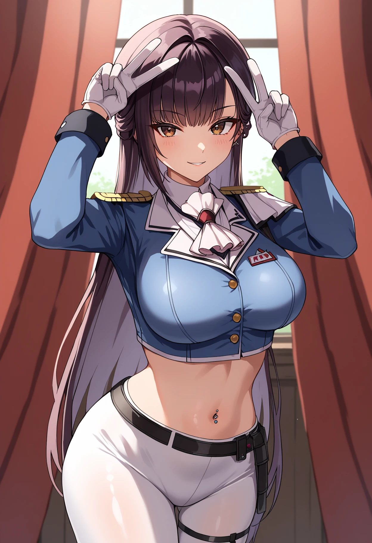 white gloves, long sleeves, crop top, white pants, uniform, military uniform, ascot, epaulettes, blue jacket, thigh strap