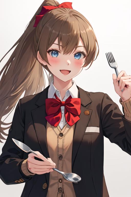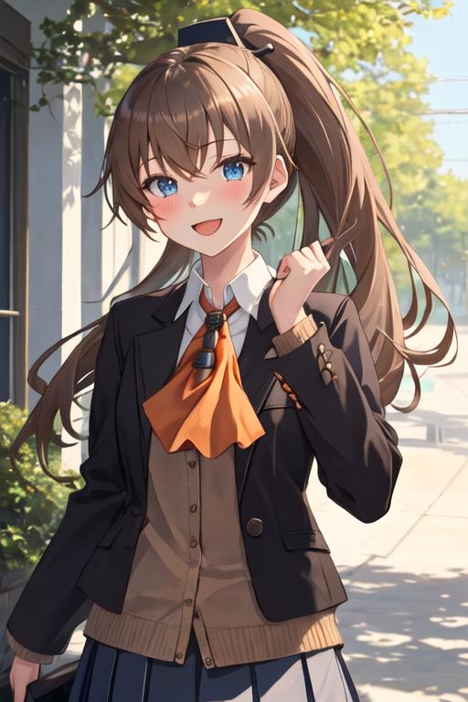 brown_hair, long_hair, ponytail, blue_eyes, smile, blush, open_mouth, hair_ornament