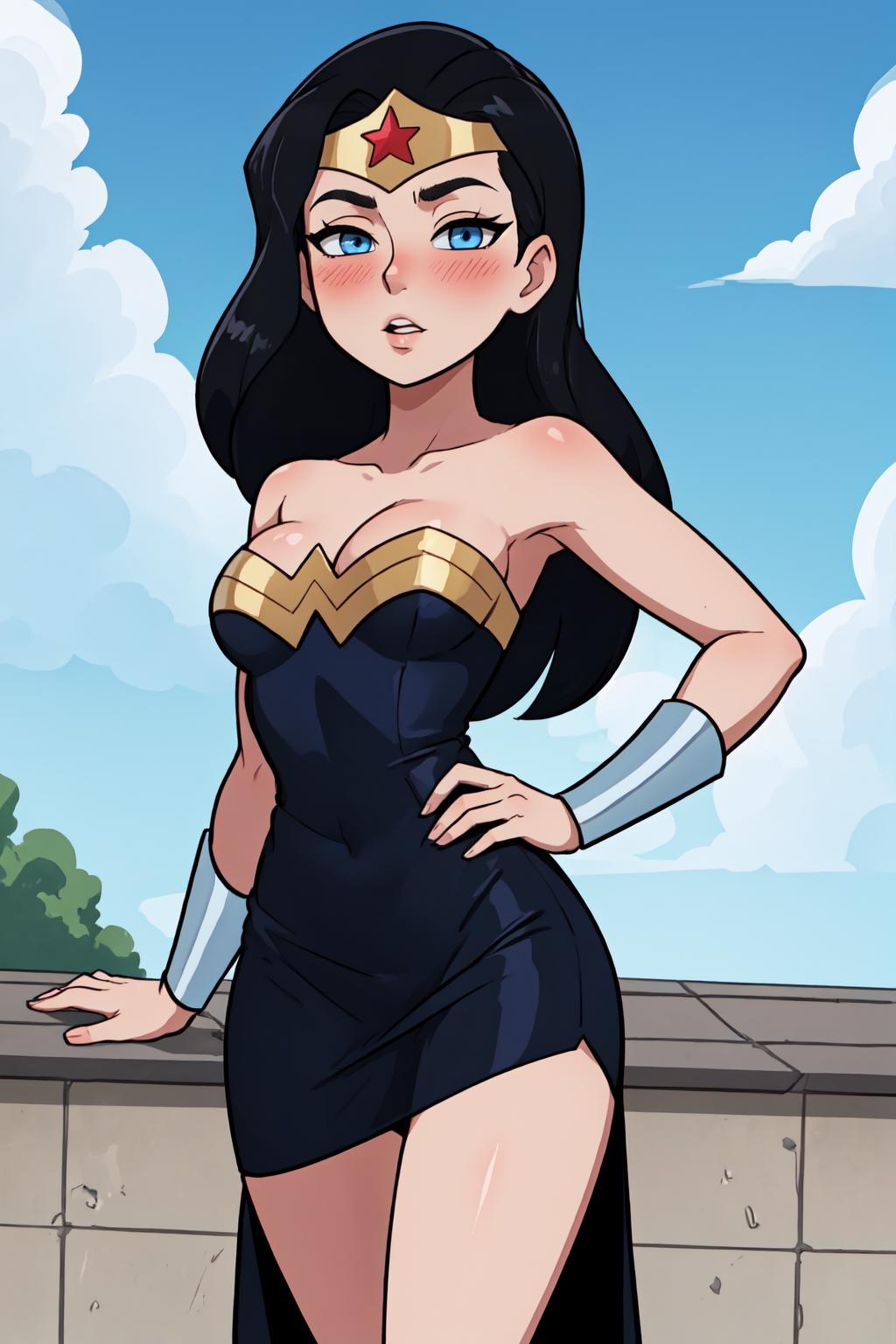 Outfit prompts : ???? shoulders, earrings, flat ?????, jewelry, leotard, superhero, tiara, boots