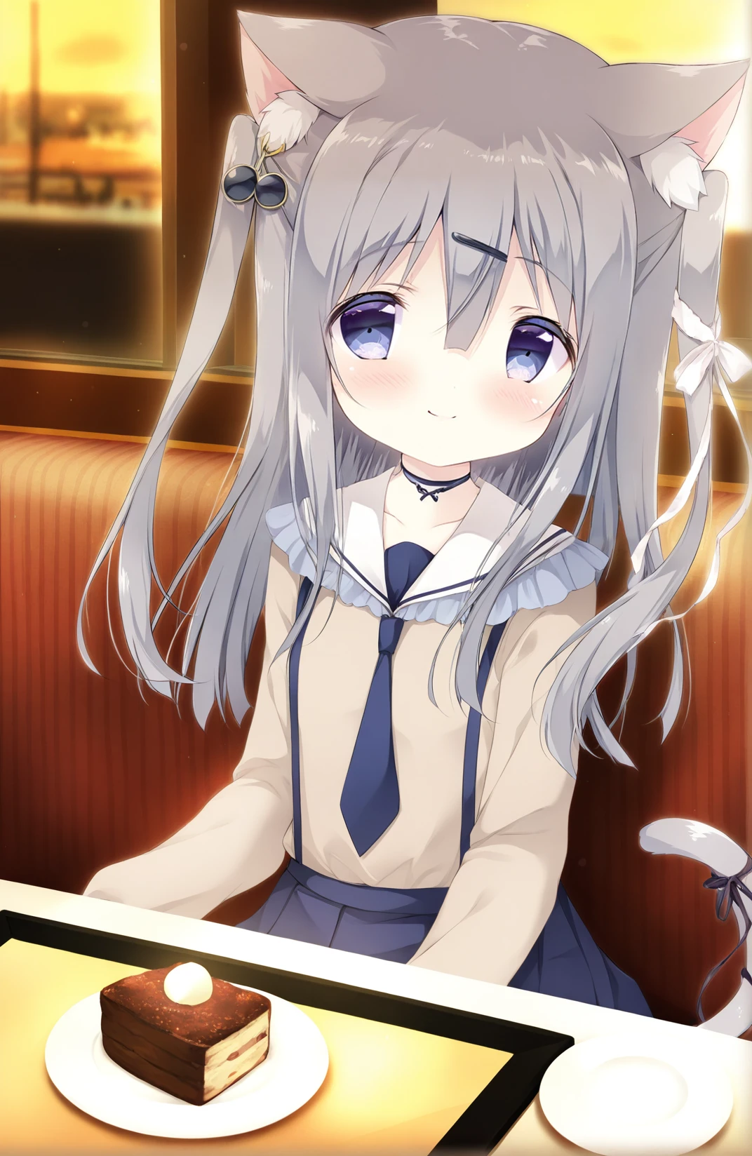 Yukimura Chieri,1girl,solo,animal ears,cat ears,cat tail,grey hair,long hair,two side up,blue eyes,animal ear fluff