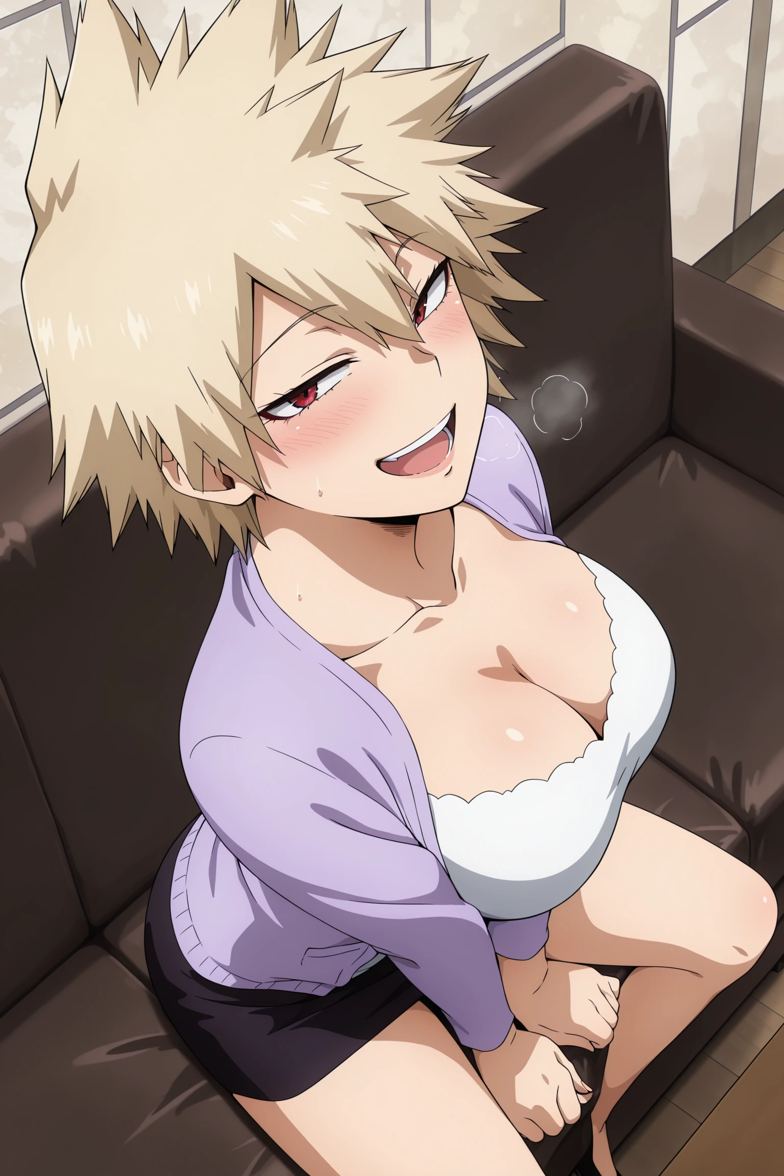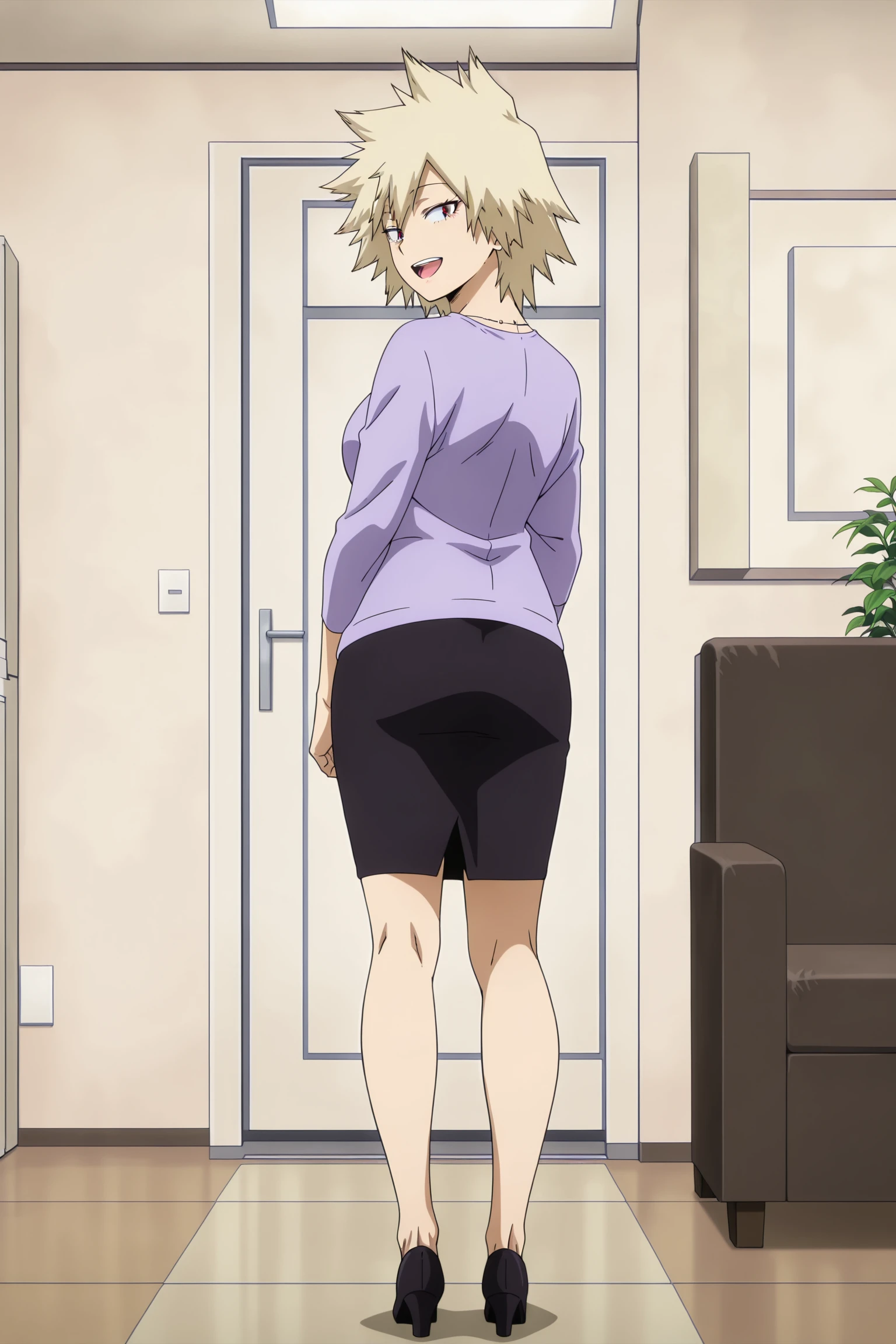 m1tsuk1b&kug0, 1girl, mature female, solo, spiked hair, blonde hair, red eyes, purple cardigan, black pencil skirt