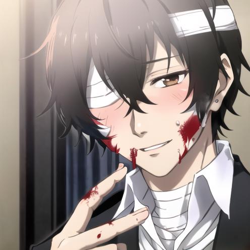 Prompt his main appearance with dazai osamu. Should he look a bit off, he's got short brown hair and brown eyes.