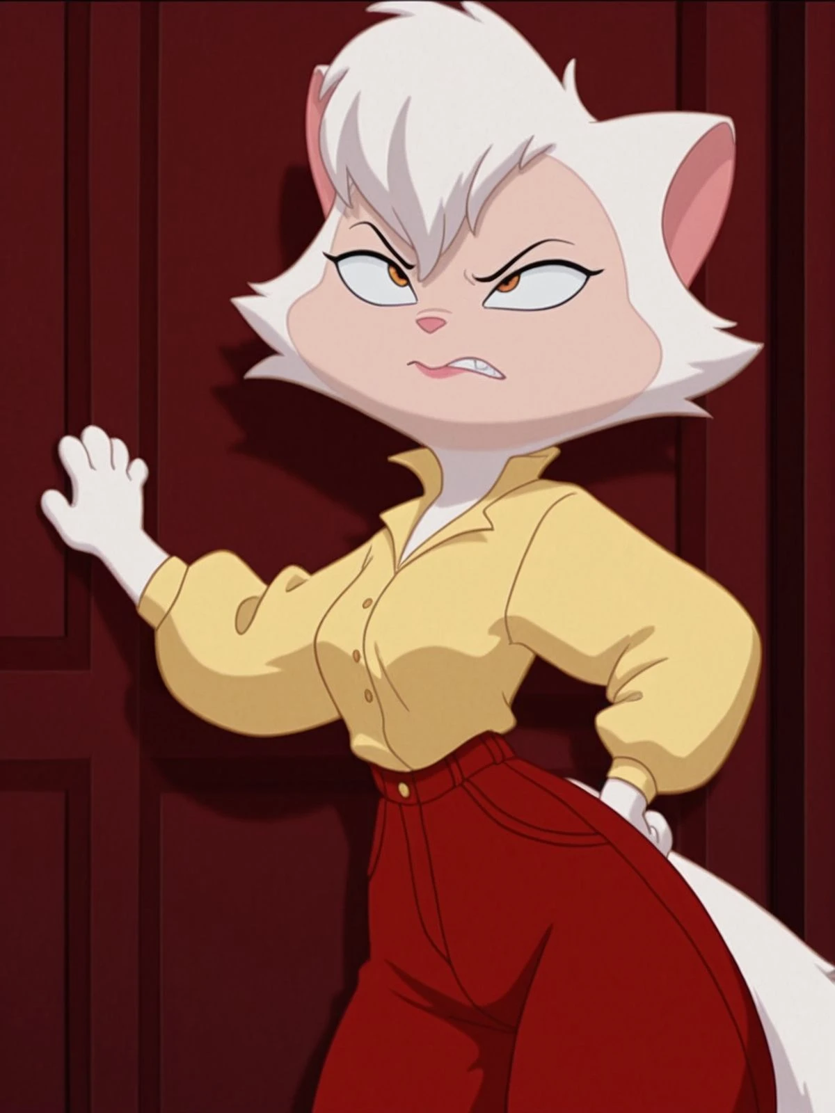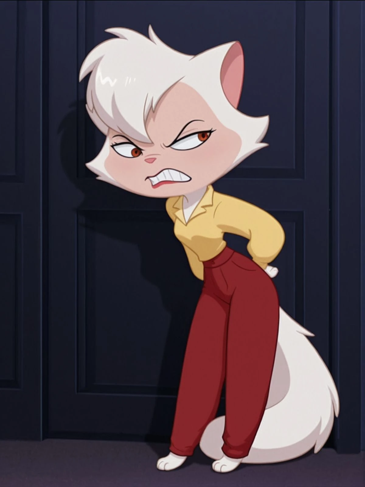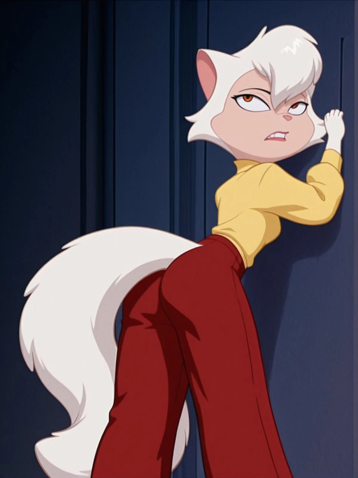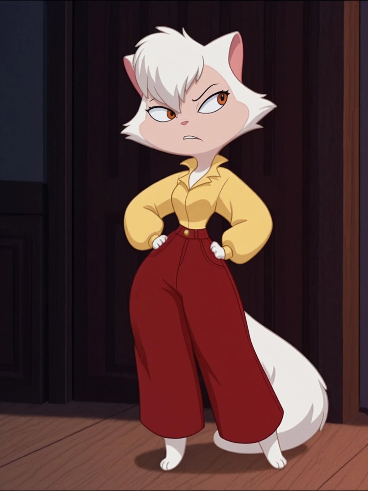 her casual clothes, red pants with a long sleeved yellow shirt, in the beggining and dancing with danny