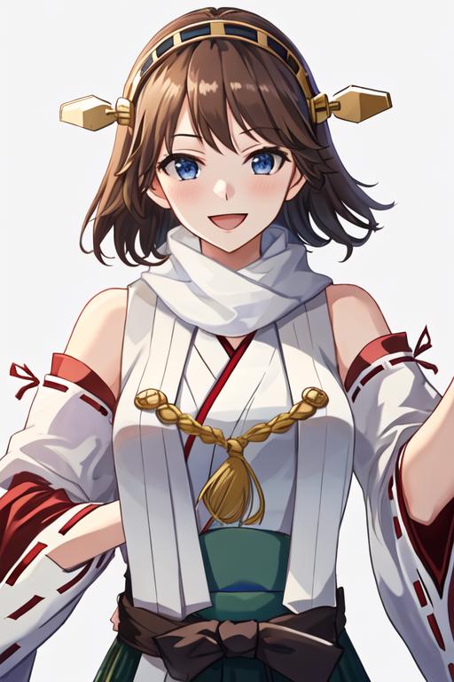 brown_hair, short_hair, hairband, headgear, nontraditional_miko, smile, blue_eyes, flipped_hair, open_mouth