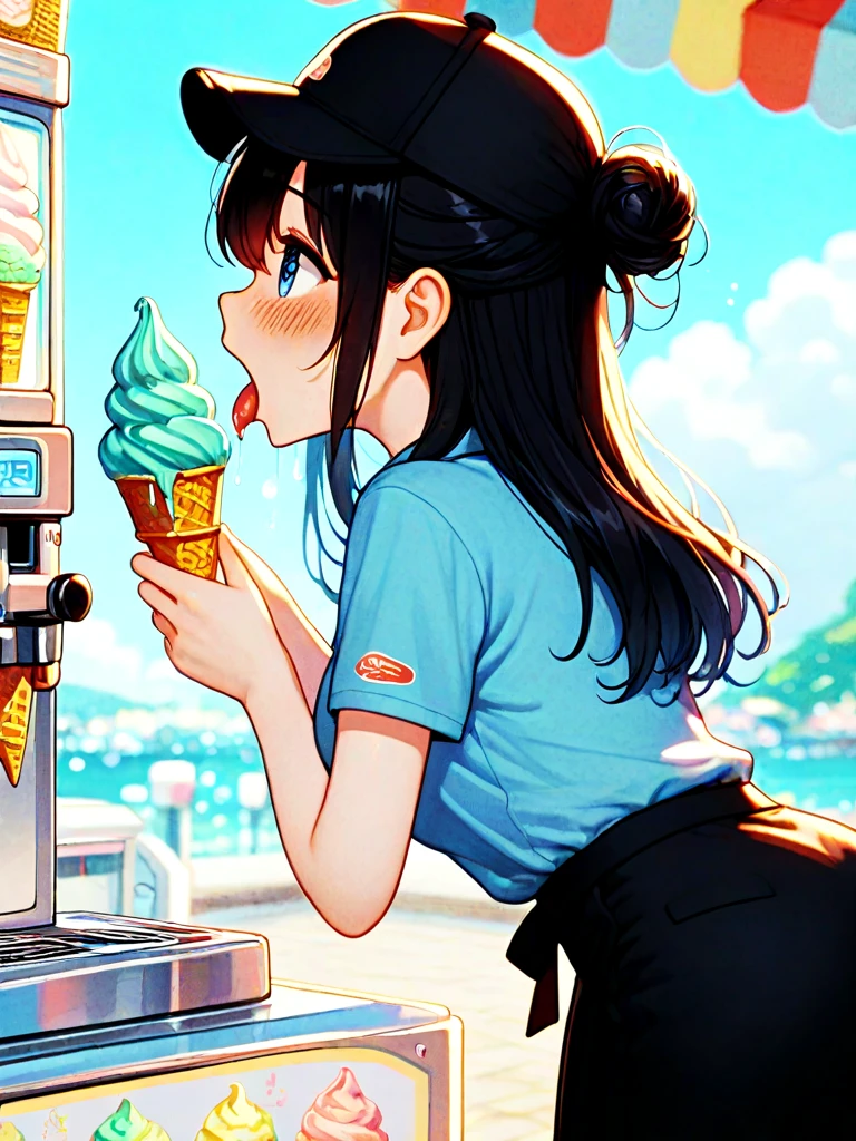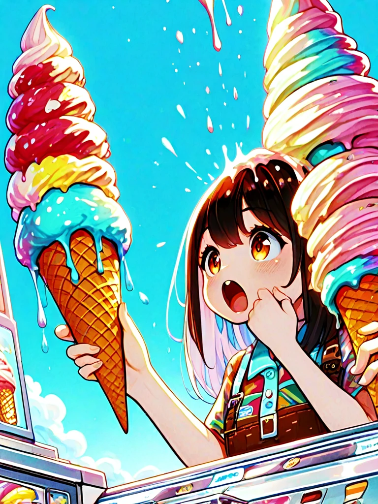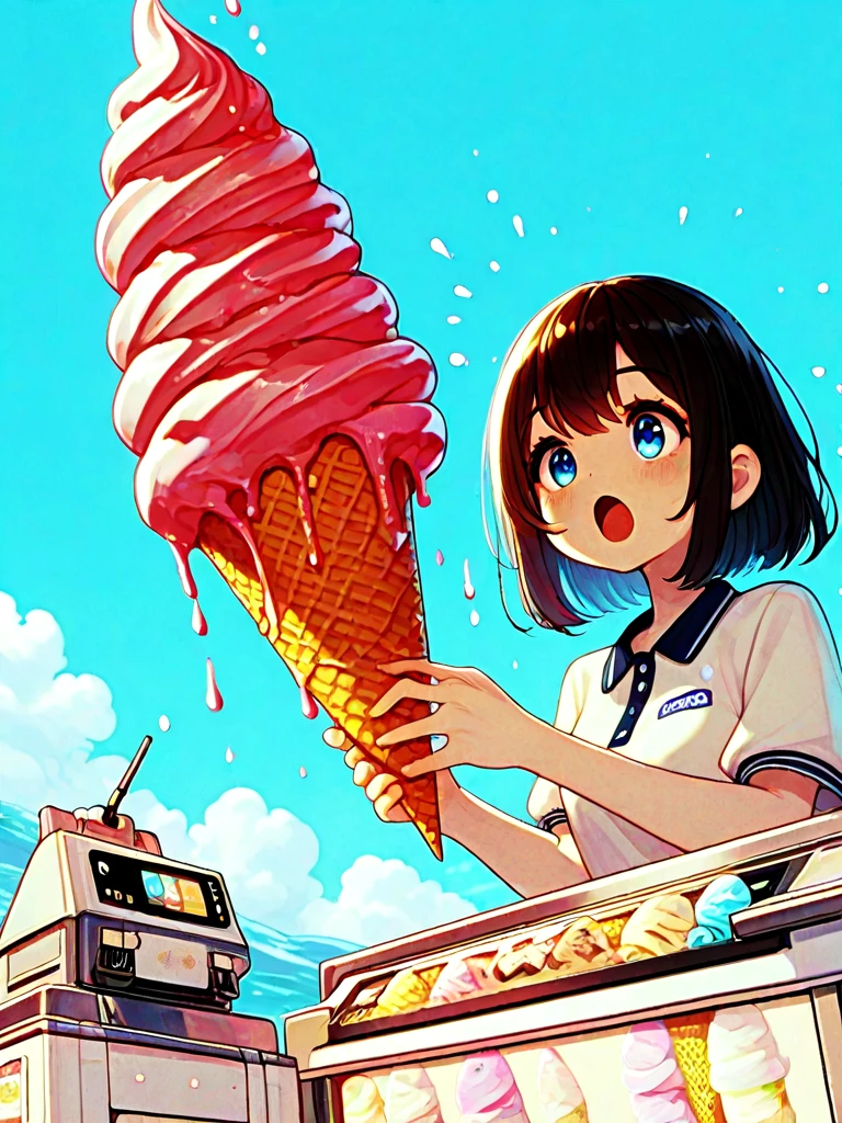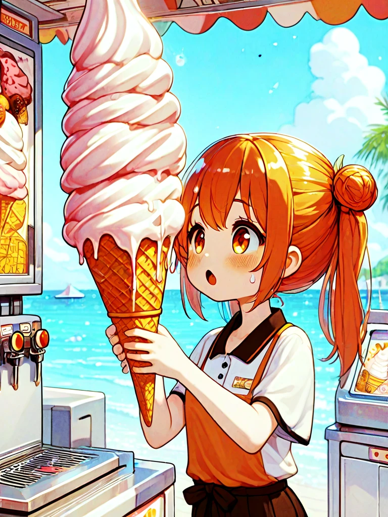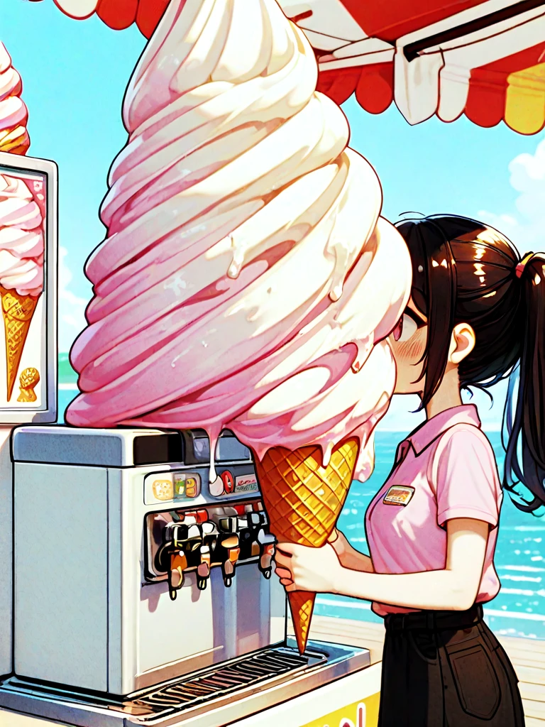 ice cream machine, huge ice cream, holding ice cream, soft serve, 1girl,