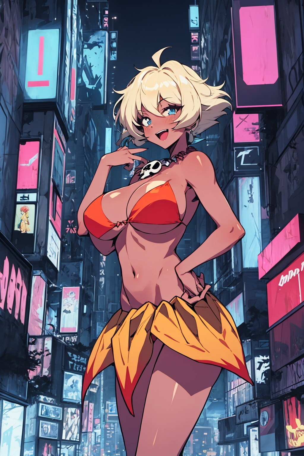 Other prompts : 1girl, blonde hair, short hair, blue eyes, earrings, necklace, dark skin, ??????, swimsuit, navel, cleavage
