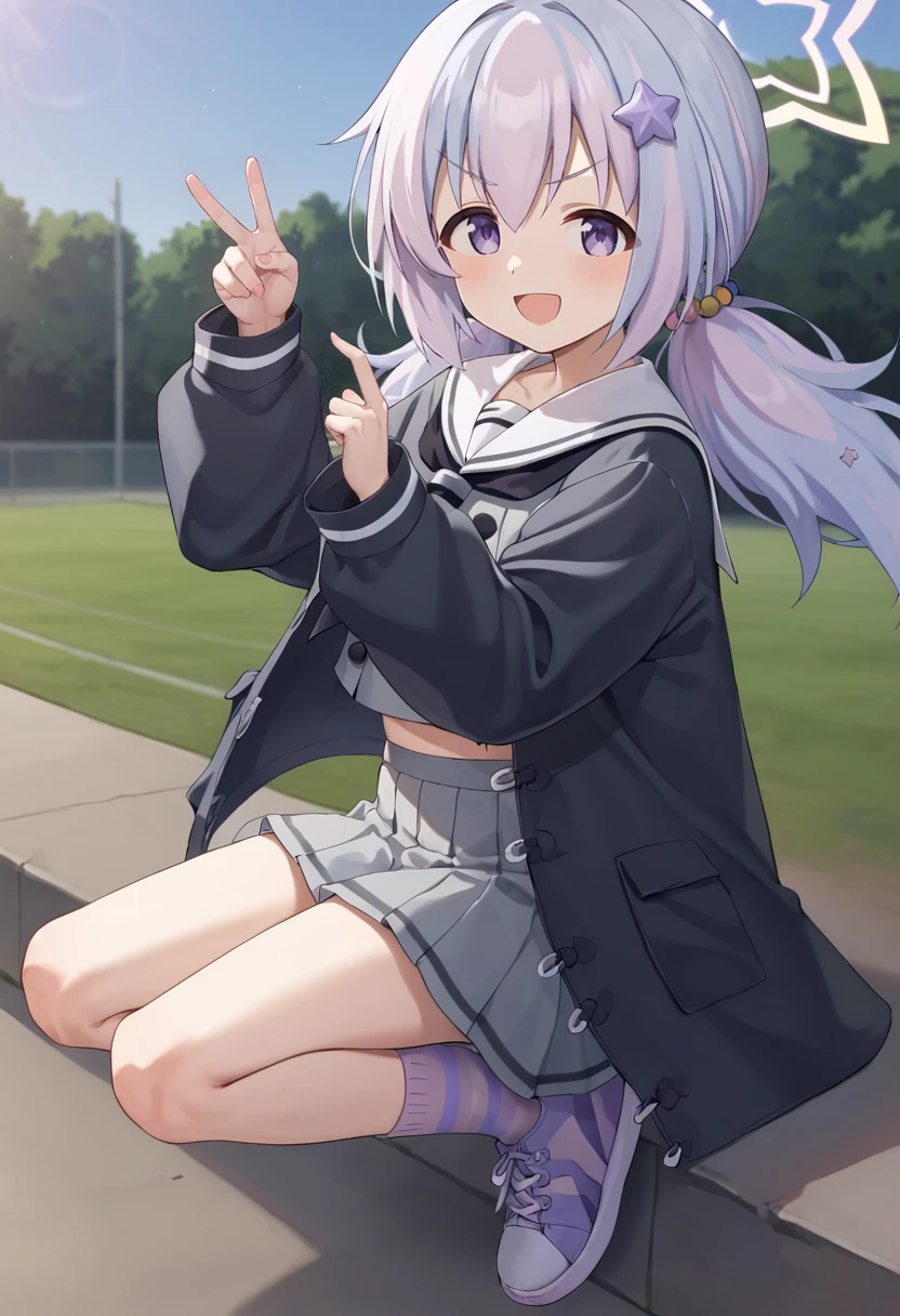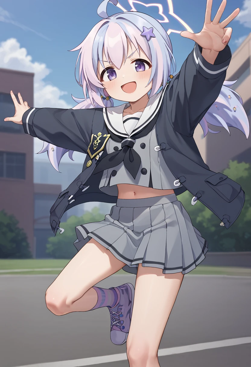 reisa \(blue archive\),purple eyes, multicolored hair,low twintails, halo,star \(symbol\),black jacket,sailor collar,grey skirt, socks,sneakers