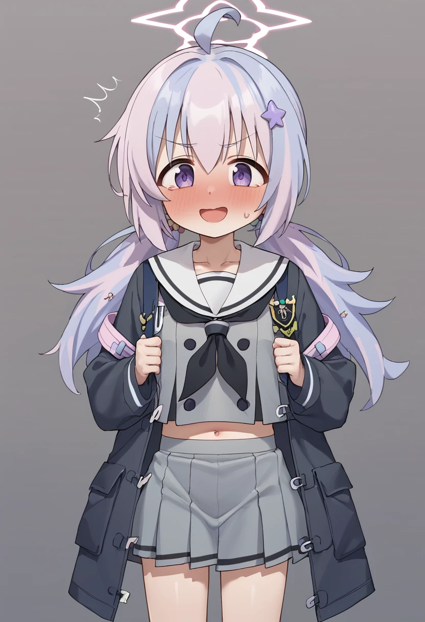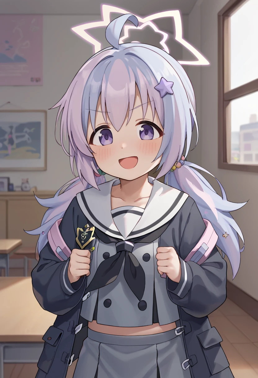 reisa \(blue archive\),purple eyes, multicolored hair,low twintails, halo,star \(symbol\),black jacket,sailor collar,grey skirt,backpack,socks,sneakers