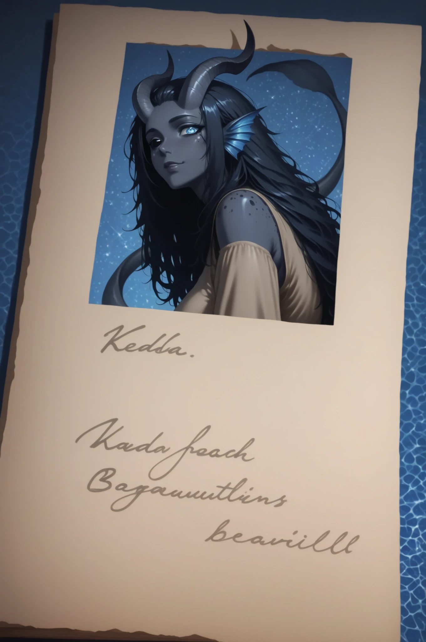 🍃Here is a tiefling (Dungeons & Dragons) character named Kedra. She has dark blue-gray skin, two fins on her head, small dark horns, a long tail ending in a leaf, pigmentation on the body, and due to one incident, only one eye with a blue iris. Kind, though a little naive, with a mischievous smile on her face. Always ready for new adventures.