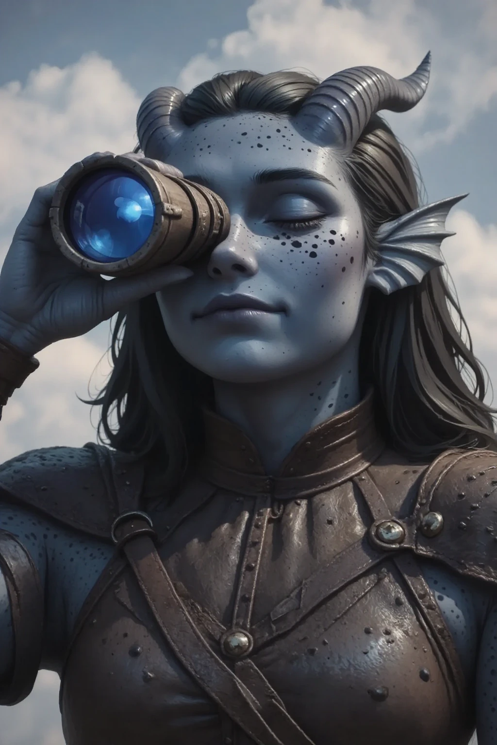 🍃Here is a tiefling (Dungeons & Dragons) character named Kedra. She has dark blue-gray skin, two fins on her head, small dark horns, a long tail ending in a leaf, pigmentation on the body, and due to one incident, only one eye with a blue iris. Kind, though a little naive, with a mischievous smile on her face. Always ready for new adventures.