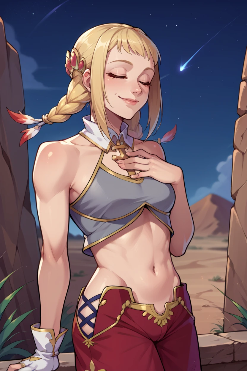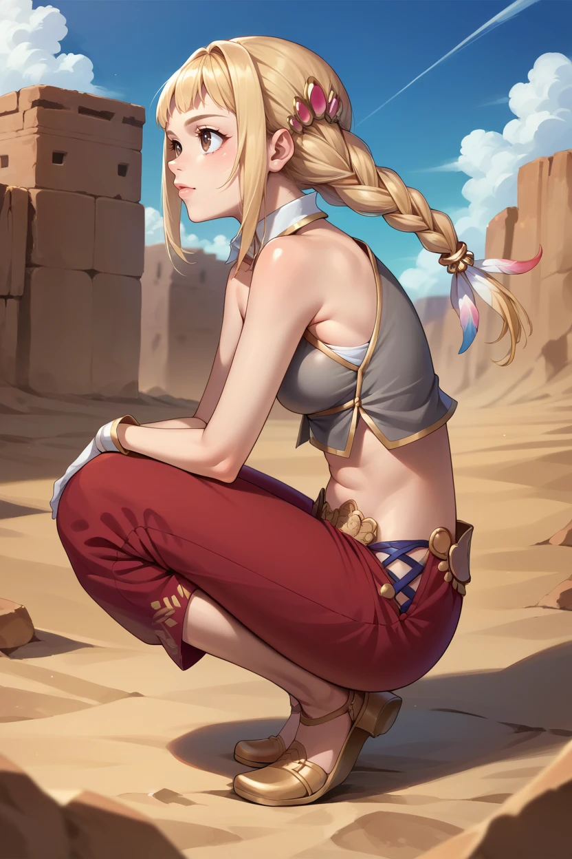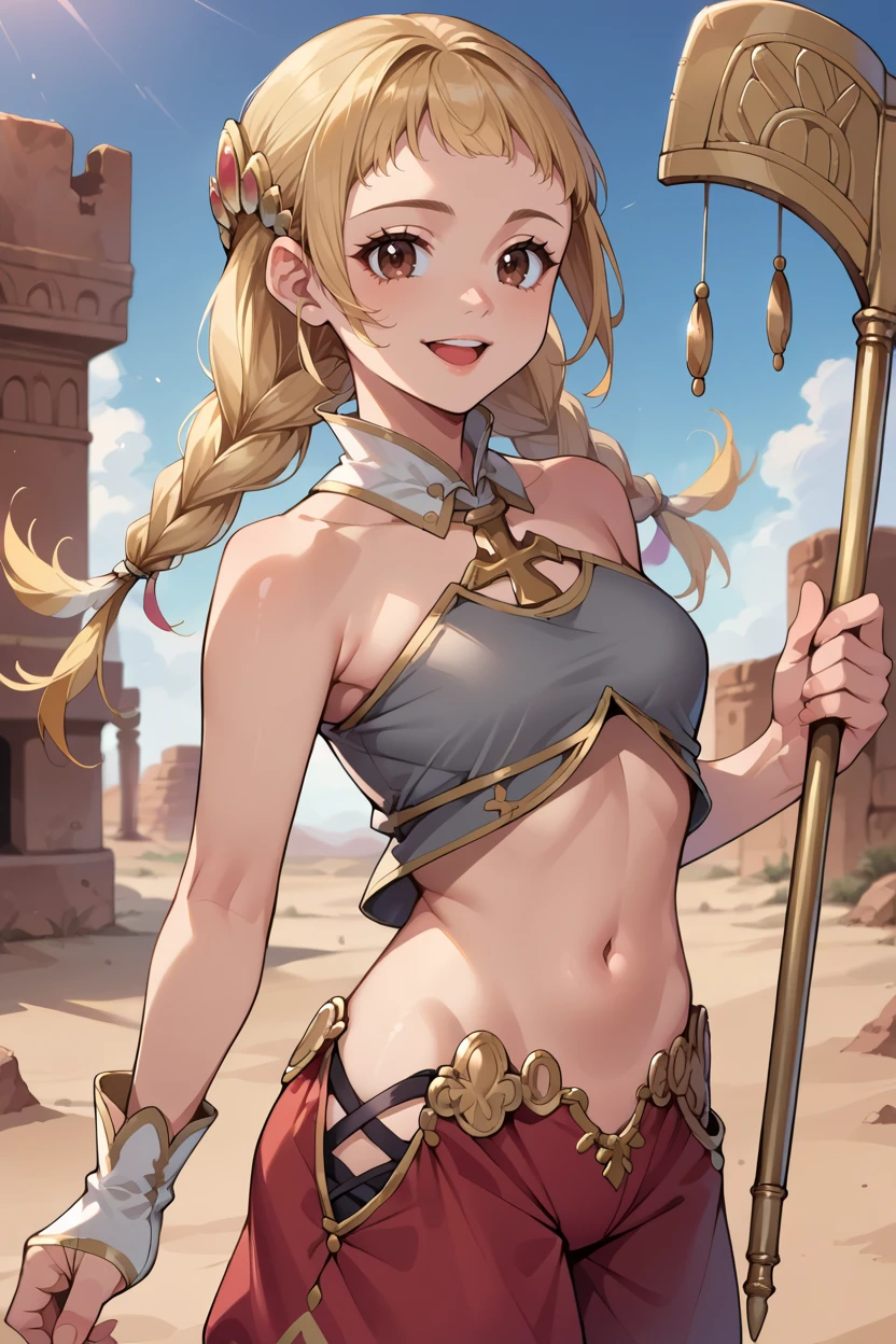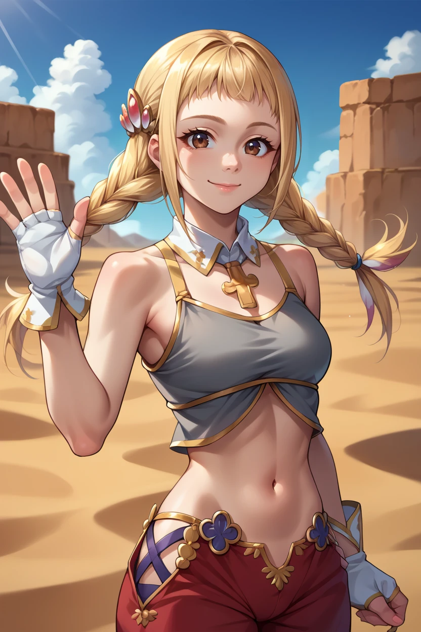 revPenelo, blonde hair, brown eyes, twin braids, hair ornament, grey crop top, detached collar, midriff, red pants, gloves