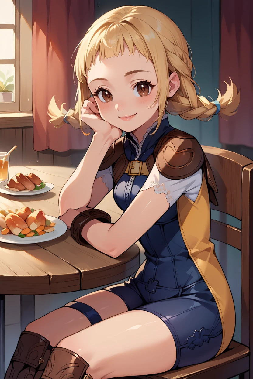 defPenelo, blonde hair, brown eyes, twin braids, bodysuit, shoulder pads, thigh straps, brown boots, bracelets