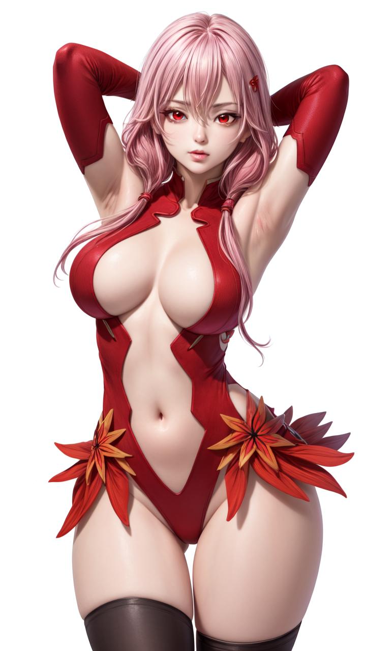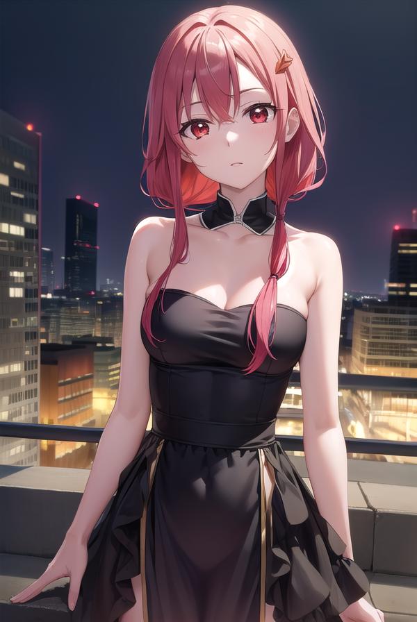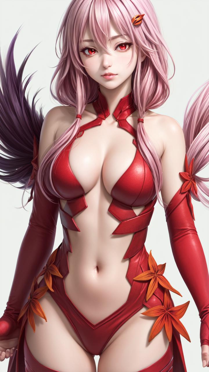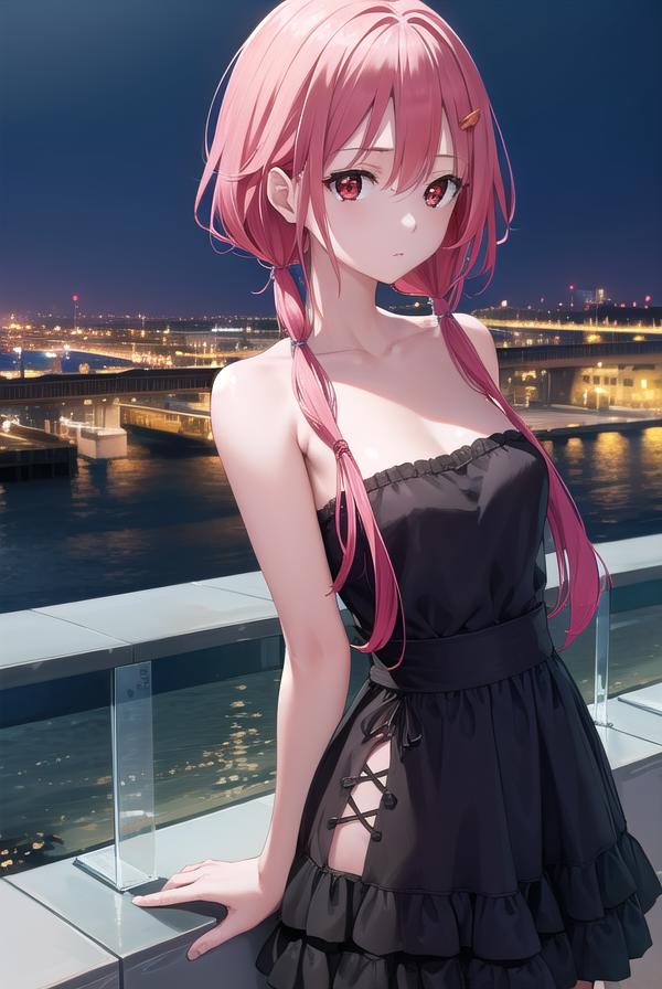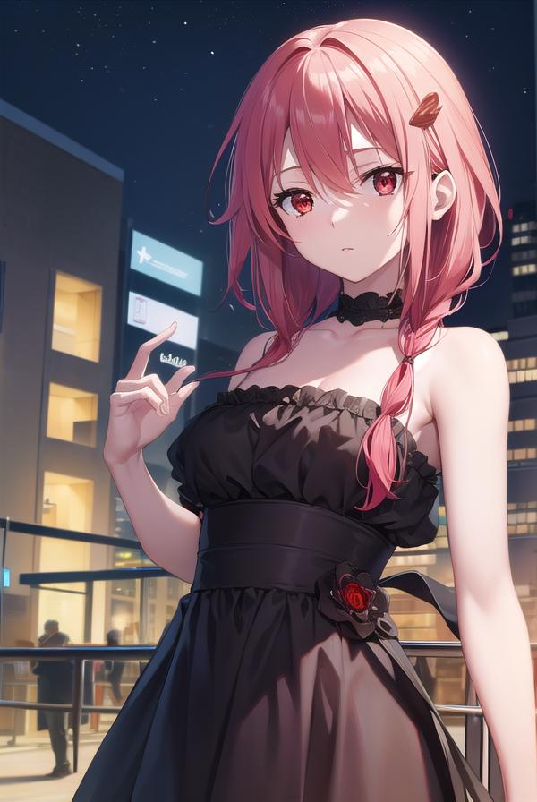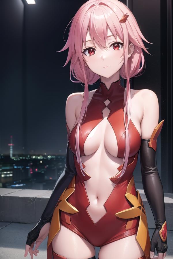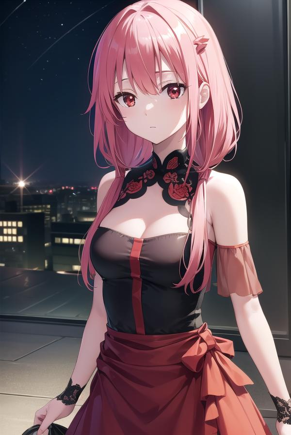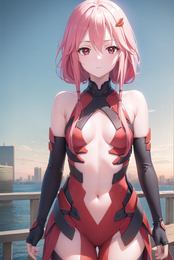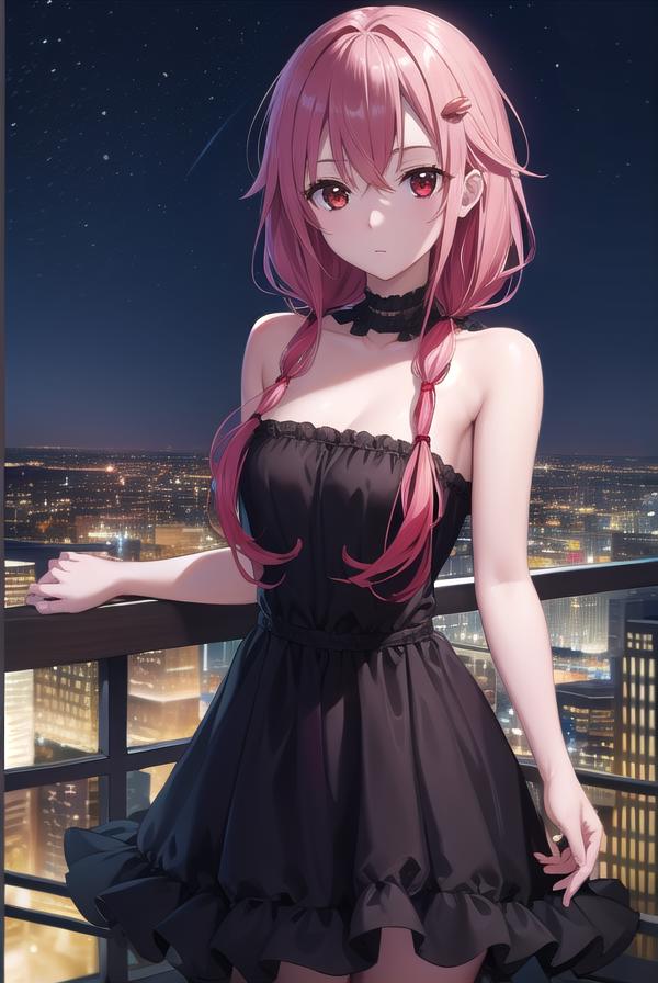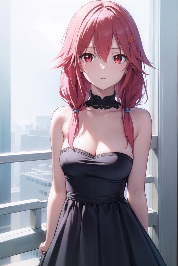inori yuzuriha, hair ornament, hairclip, long hair, pink hair, (red eyes:1.5), twintails,