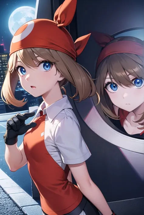 pokemonmay, blue eyes, brown hair, bandana, long hair, red bandana, twintails, hair between eyes,