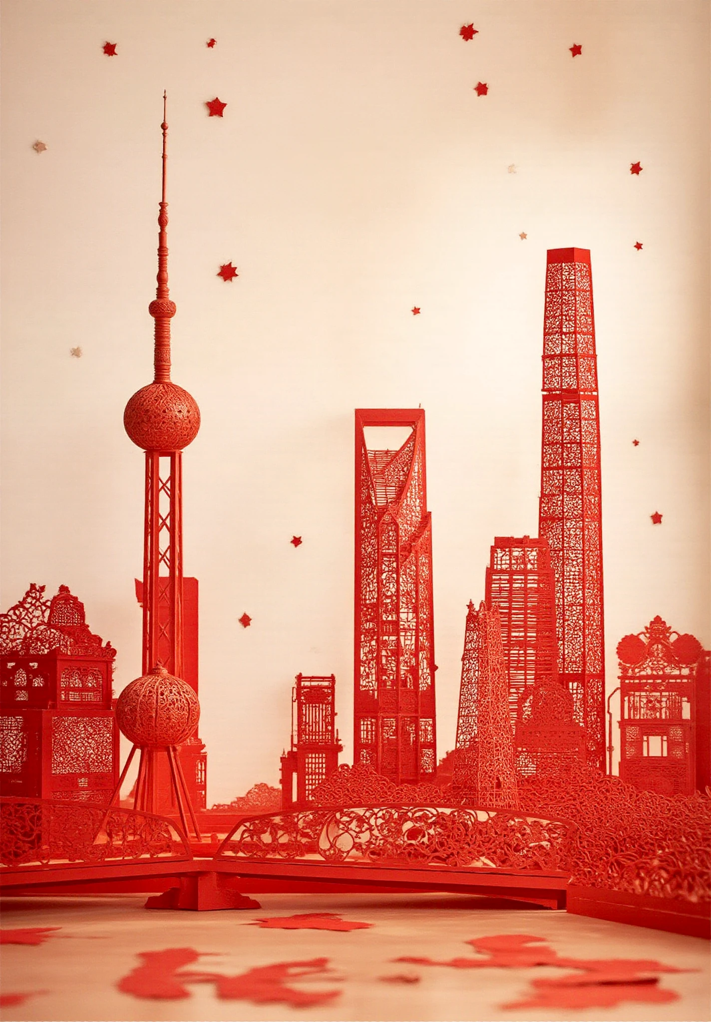 Новогодний стиль вырезанной из бумаги_<Здание+люди+Вещи >