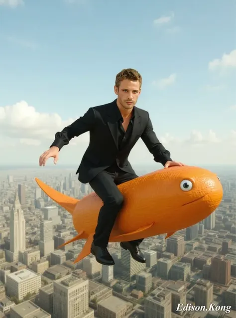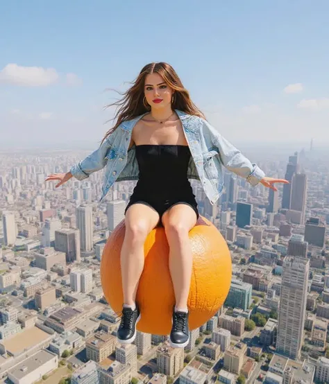 Крупный план передней части тела, сосредоточение на выражении лица и летающем апельсине, нет пальцев, нет белой одежды. Тот же персонаж едет на летающем апельсине, парящий над городом, как будто это совершенно нормально. 🍊✨
