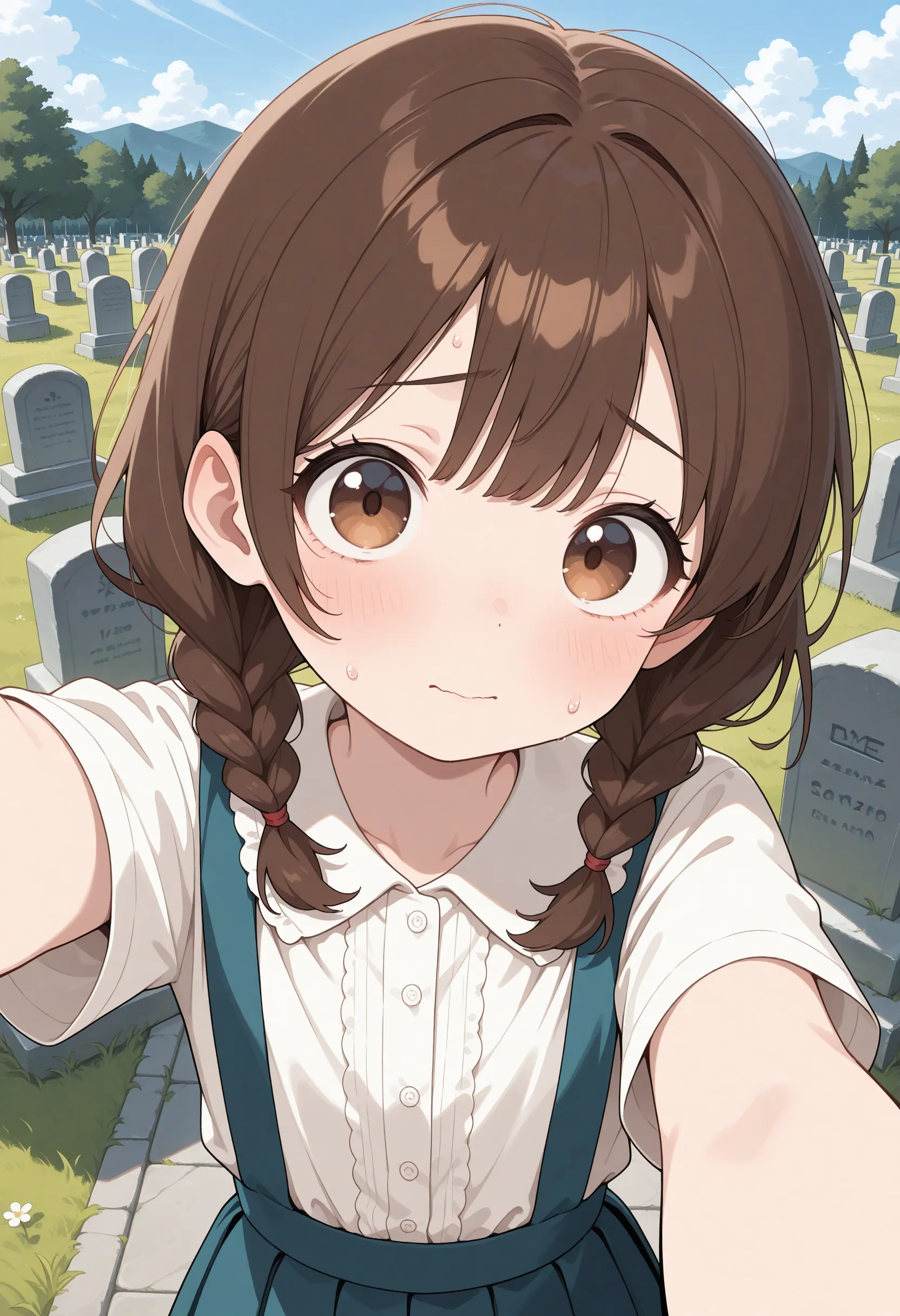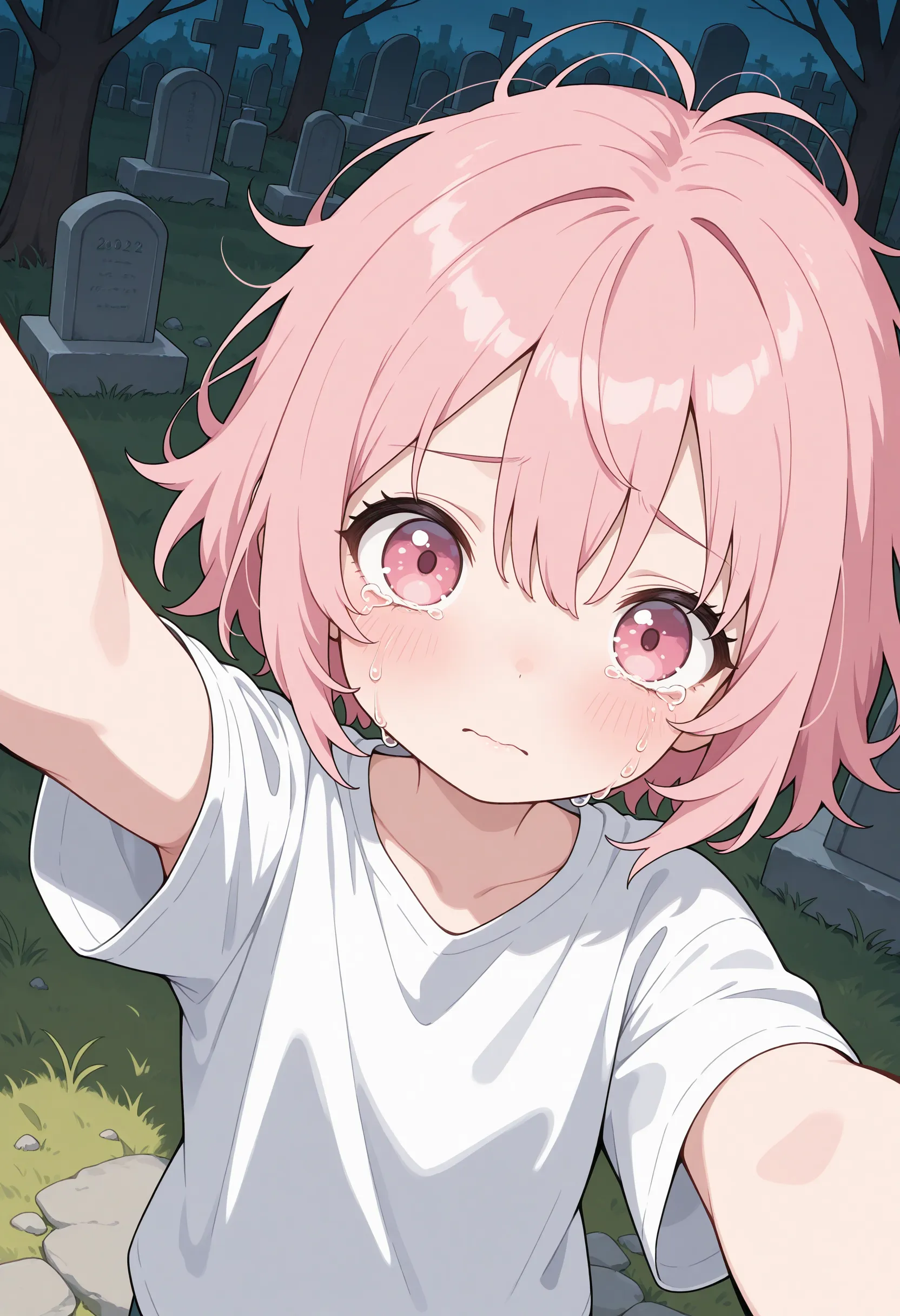 Создайте аниме-девушку на кладбище, делающую селфи с подсказкой. Используйте "случайный" автоматически выбрать подсказку.