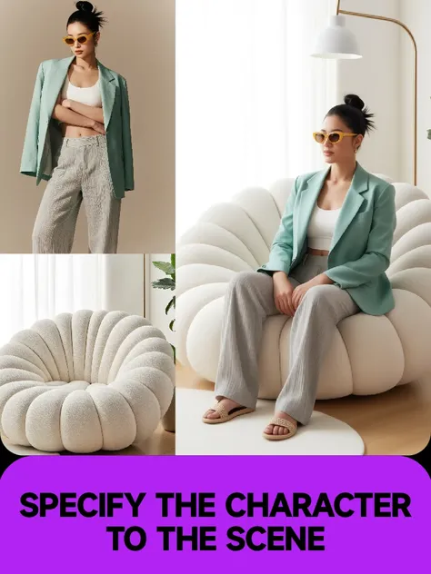 Загрузите соответственно ваш персонаж или изображение персонажа, а затем загрузите изображение сцены. Просто введите команду, и персонаж может быть идеально интегрирован в сцену.