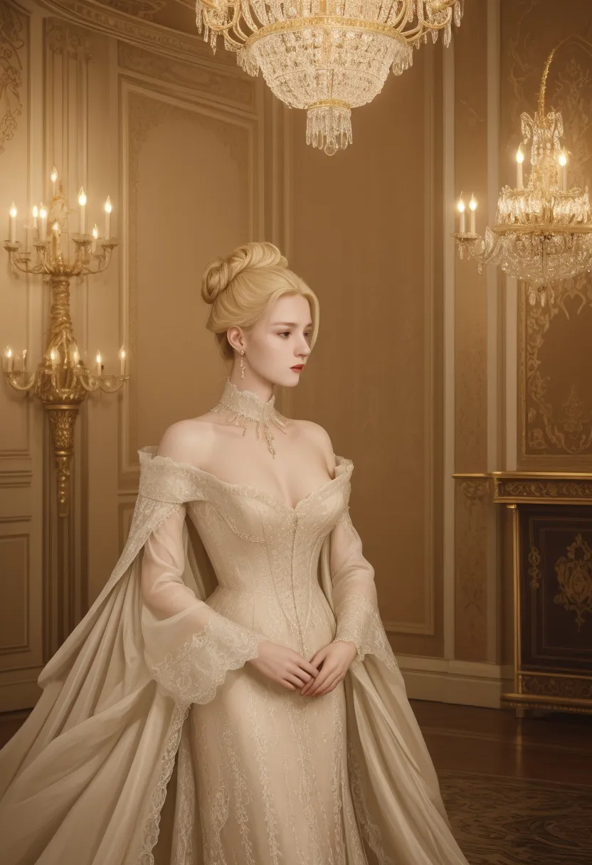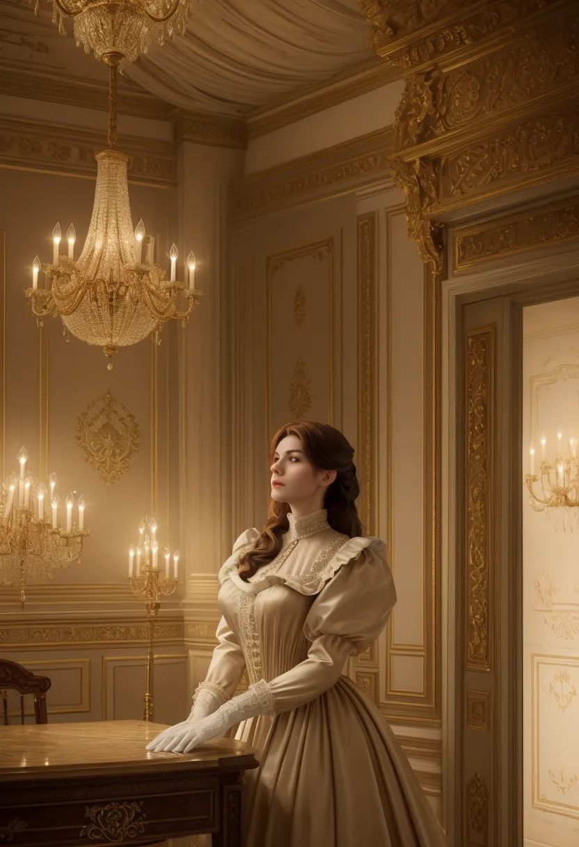 Женщина с осанкой и изысканностью, облаченная в роскошное платье с замысловатыми деталями, сидит грациозно в комнате, залитой теплом, земляные тона. Ее богатые каштановые волосы уложены в мягкие волны, украшенными нежным жемчугом. Атмосфера вокруг нее - это классическая элегантность, с тусклым светом свечей, подчеркивающим тонкие текстуры ее наряда и мягкое сияние ее спокойного выражения лица. Всего лишь с одной подсказкой, вы можете уловить сущность вечной красоты, где каждая складка ткани и мерцание света рассказывают историю тихого благородства.