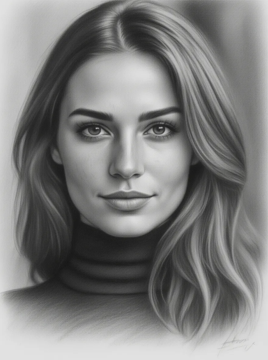 Выйти за рамки фильтров. Нарисуй свое фото как вневременное, рисованный от руки эскиз, запечатлевая ваши уникальные черты и выражение с художественными деталями.