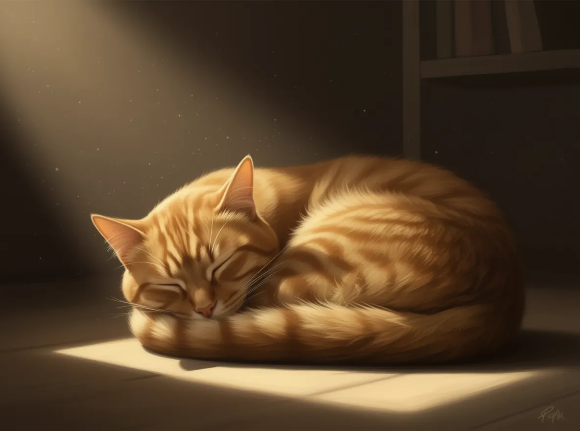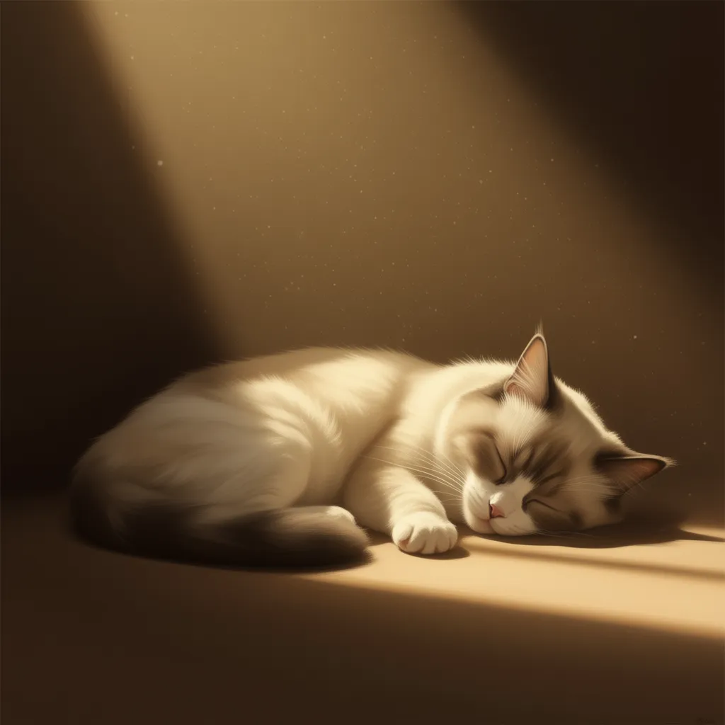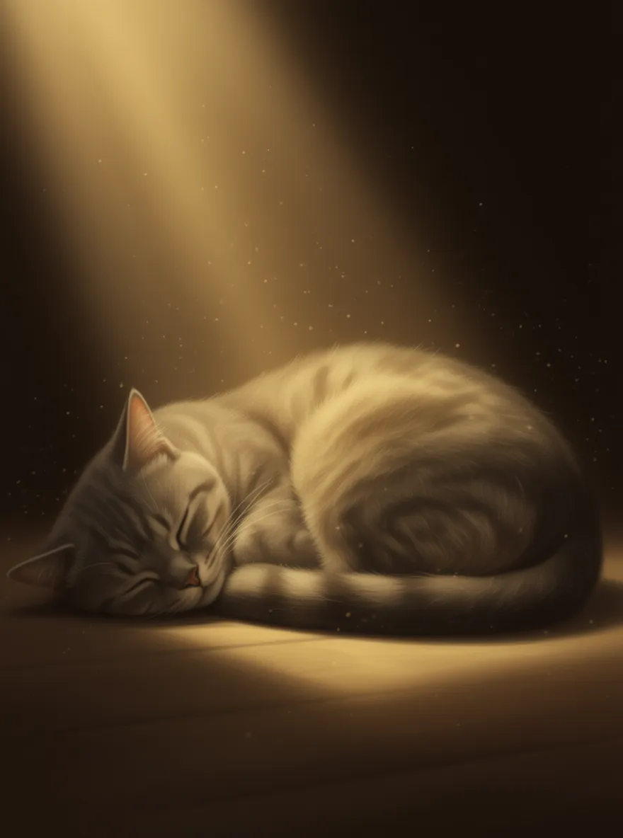 Нет ничего более умиротворяющего, чем кошка, дремлющая на солнце. Наш ИИ улавливает это идеальное ощущение, преобразование вашего фото в вневременной портрет вашей кошки, мирно спящей в тепле, Пыльный солнечный луч.