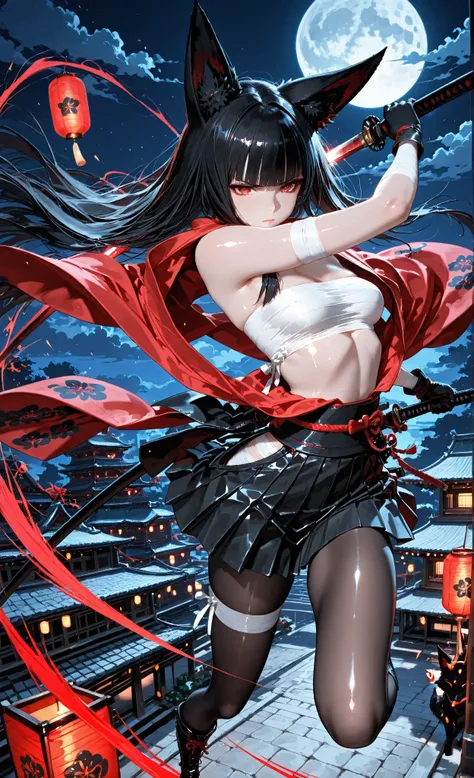 (Sitting on the roof of a building and looking down), A beautiful, slender, tall girl with a very pretty face, strong, determined red eyes, long, straight, lustrous hair, blunt bangs, a princess cut, fox ears the same color as her hair, smooth, fair skin, small, natural , a tight waist, shapely legs, and a perfect , White bandages wrapped around her , black blazer with a red flower design, black pleated skirt, white stockings with a red flower design, black combat gloves, black lace-up long boots, school uniform, and a Japanese sword, (Late night, large full moon, school building rooftop), looking at viewer, Cowboy shot close up, (perfect pose), (cinematic), (masterpiece: 1.3), 8K, highest resolution, highest quality, highest level, highest image quality, intricate details, exquisite details, Chibi,