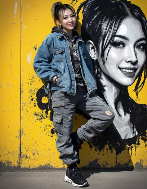 一个坚韧的街头服装肖像/女人靠在一面大胆的黄色墙上,有一幅引人注目的矢量壁画, ภาพยนตร์และสมจริงสูง.