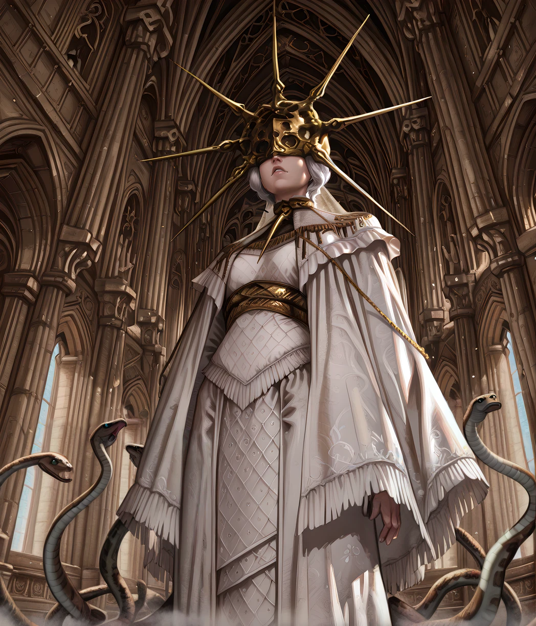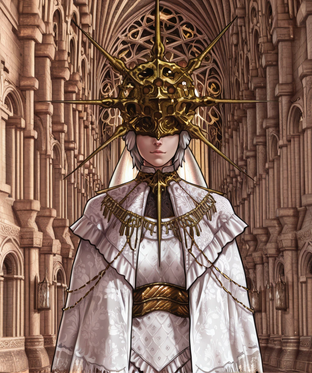 gold jewelry, white dress, long sleeves, gold mask, - more default