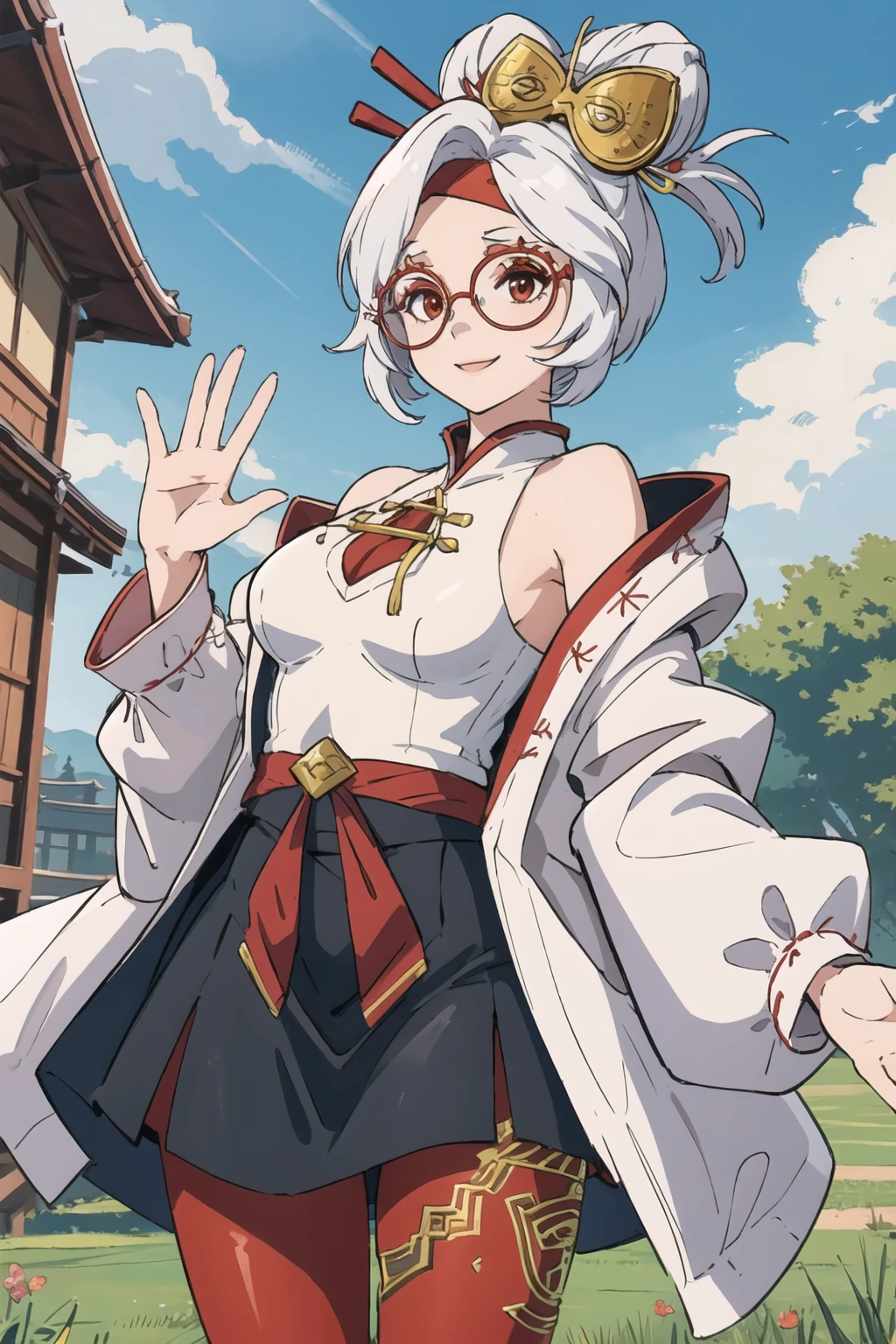 Add "red glasses, hair ornament, hair stick, red headband, white shirt, ???? shoulders, white jacket, black skirt, orange leggings, high heels" for her typical look.