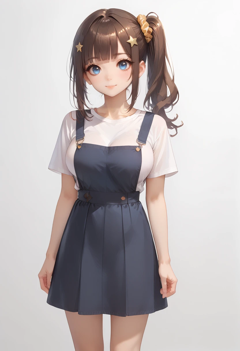 Recommended prompt: kanzaki-sumire, brown hair, blue eyes, ?????????????, star hair ornament, side ponytail, hair scrunchie, long hair, round ???????, skinny, blunt bangs, long eyelashes