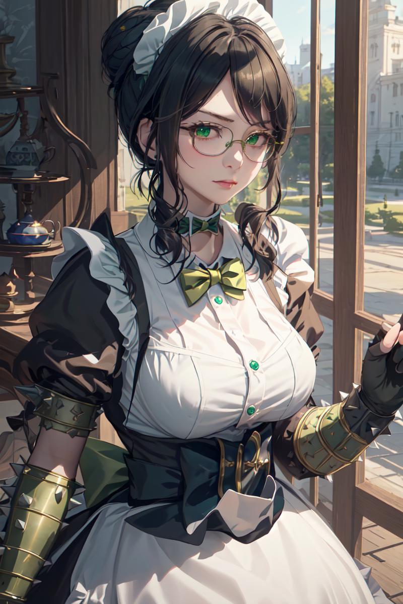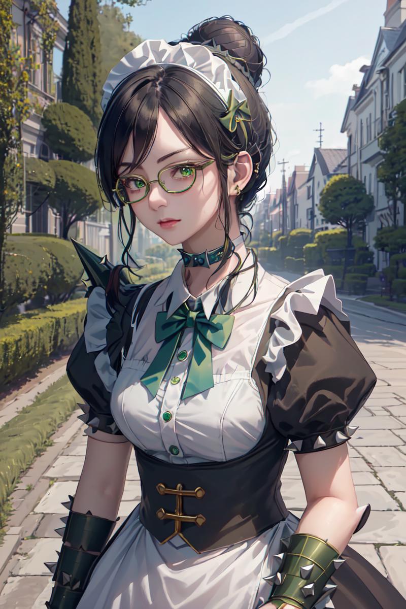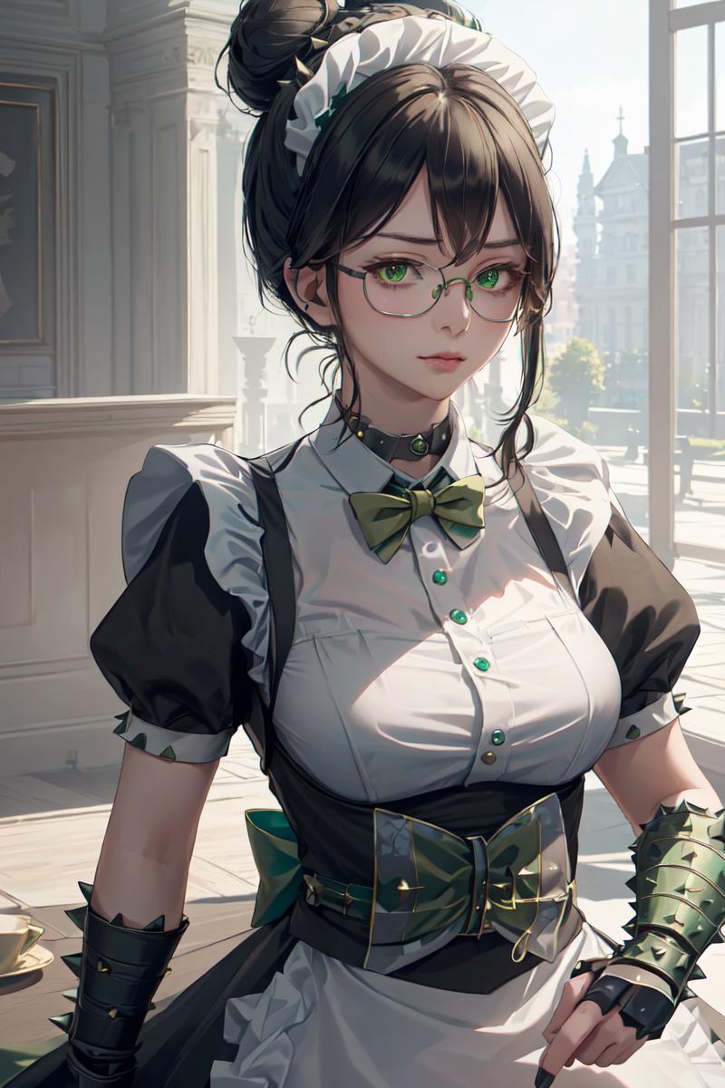 For better appearance add "black hair, (blue bowtie:1.3), (green wristband, green gauntlets, spikes:1.1), glasses, green eyes, maid, single hair bun, dress, choker, maid apron,"