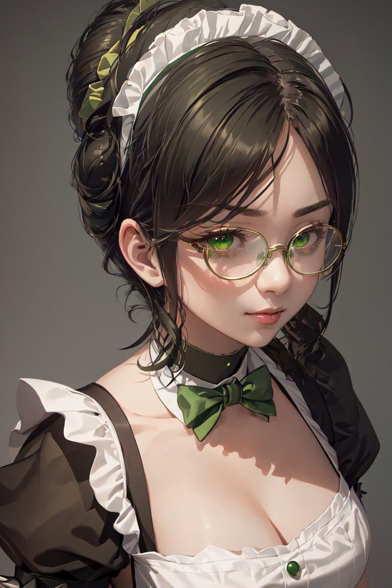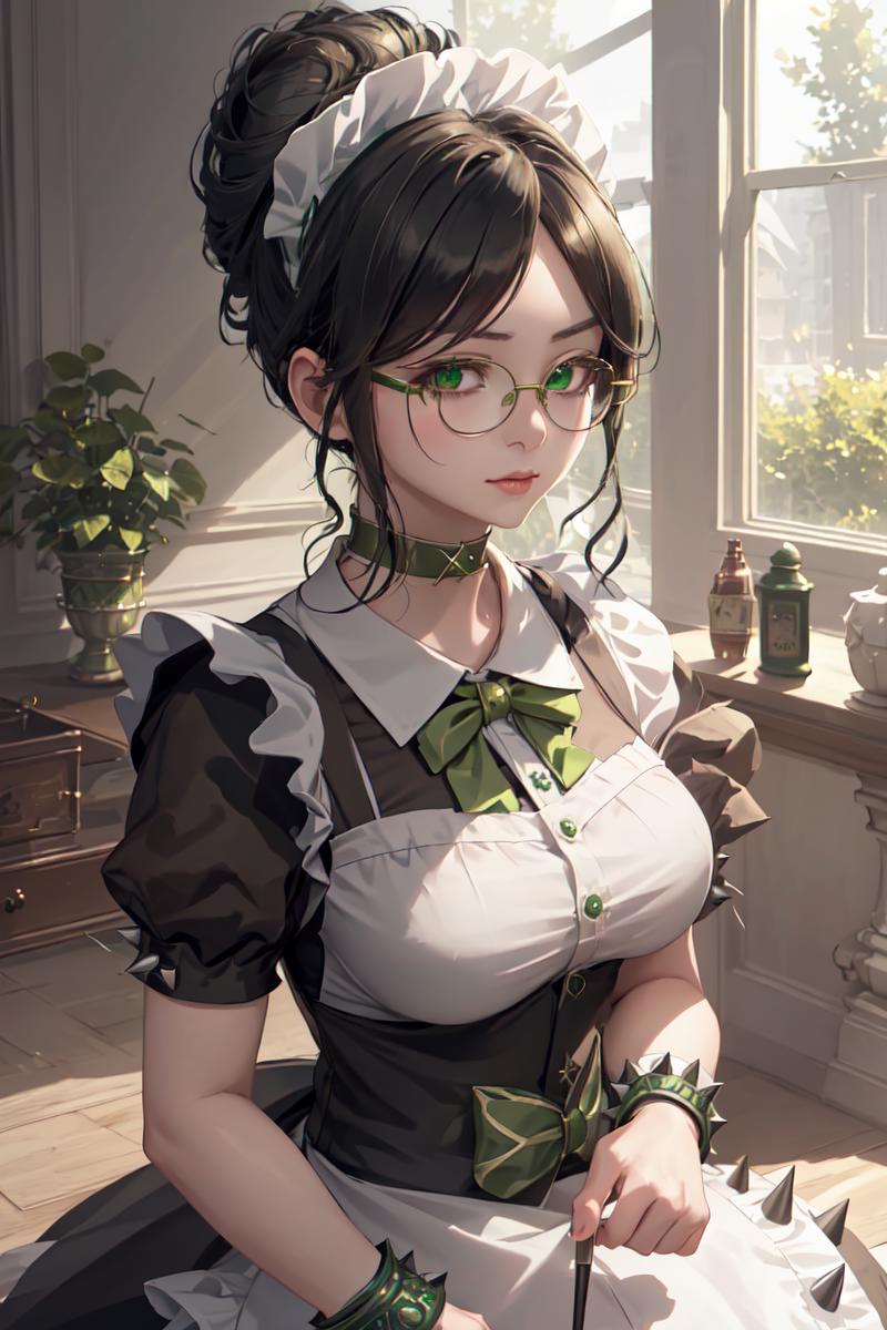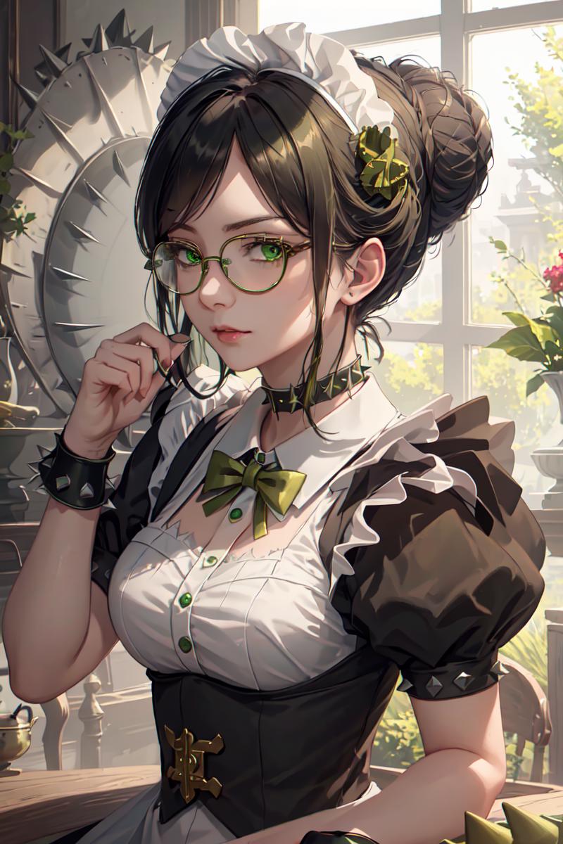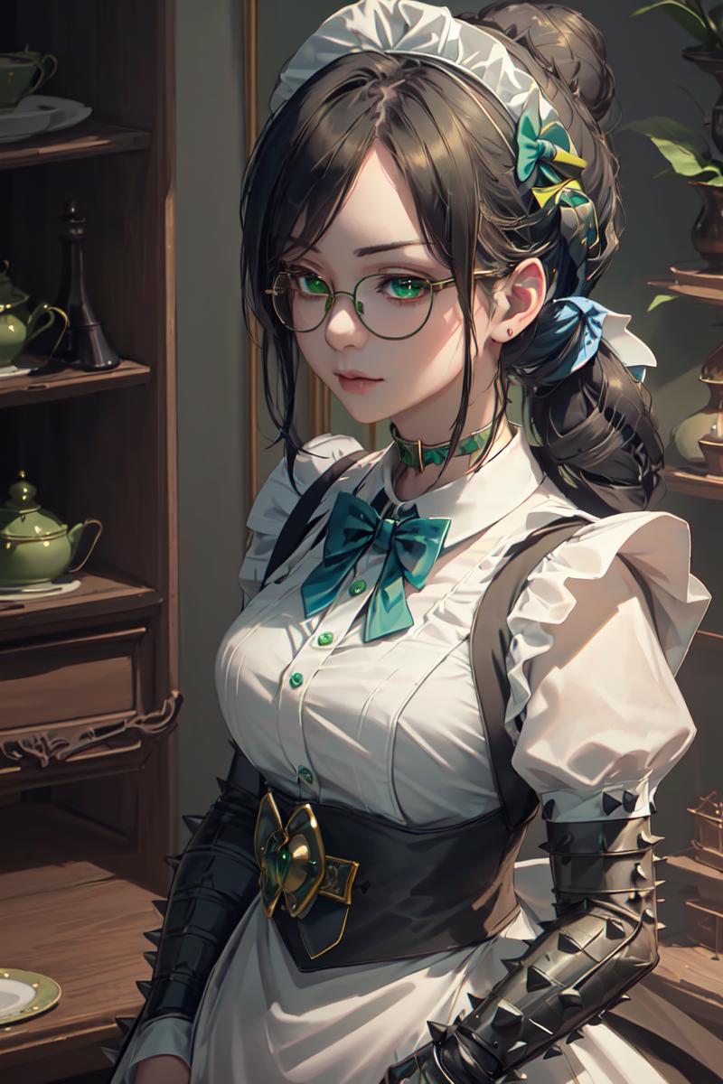 For better appearance add "black hair, (blue bowtie:1.3), (green wristband, green gauntlets, spikes:1.1), glasses, green eyes, maid, single hair bun, dress, choker, maid apron,"