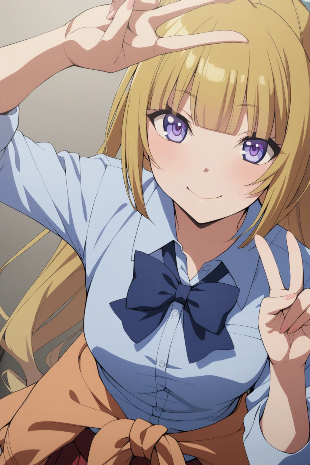Base Prompt: karuizawa, 1girl, blonde hair, ponytail, hair scrunchie, blunt bangs, purple eyes, blunt bangs, purple eyes,