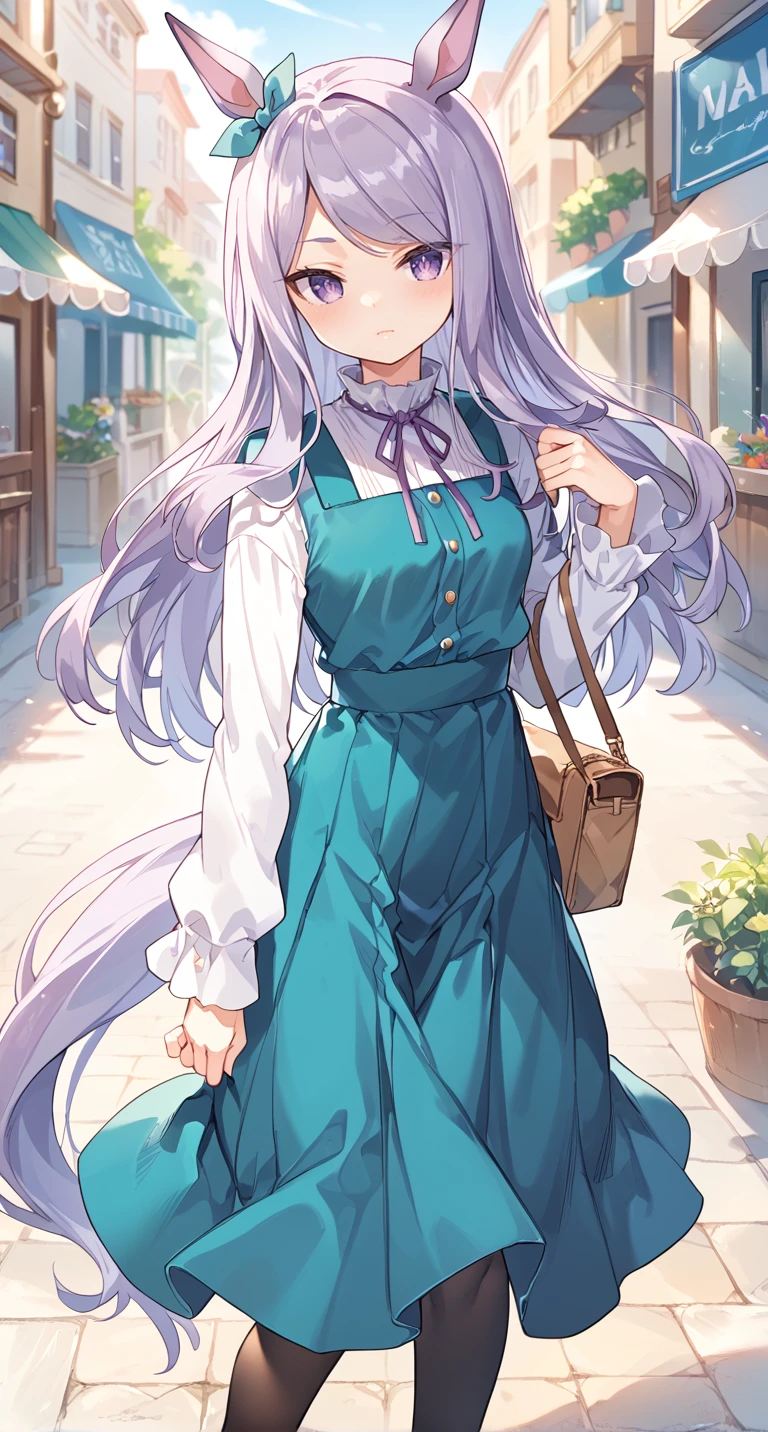 mjm casual, mejiro mcqueen (umamusume), animal ears, aqua dress, blue dress, green dress, dress, highres, horse girl, purple hair, ribbon, shirt, tail, violet eyes, white shirt, blush, ear ribbon, eyebrows visible through hair, eyes visible through hair, long hair, long sleeves, neck ribbon, horse ears, horse tail, pinafore dress, black pantyhose, long dress, purple eyes, swept bangs, purple ribbon, bangs, casual, green ribbon, pleated dress, alternate costume,