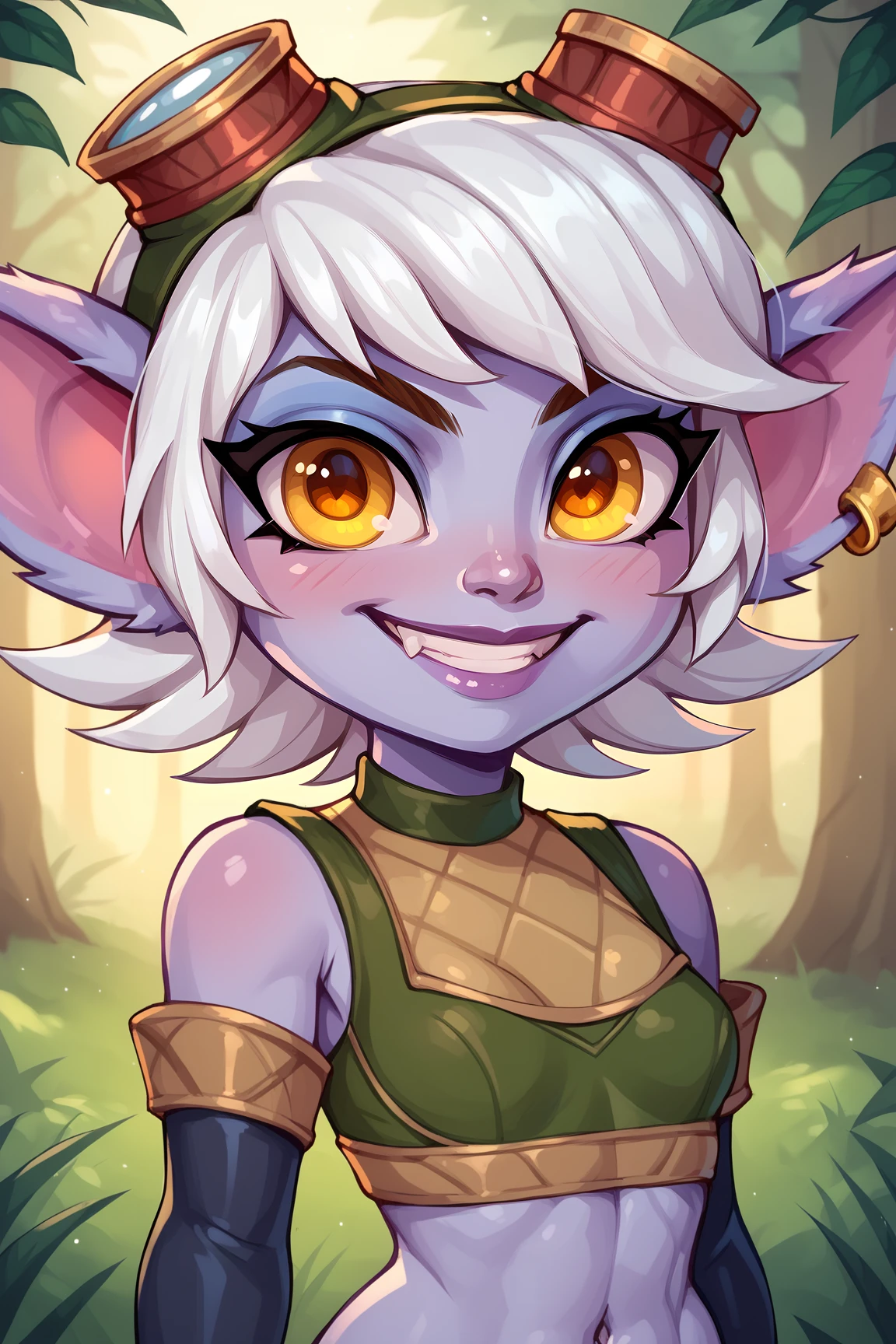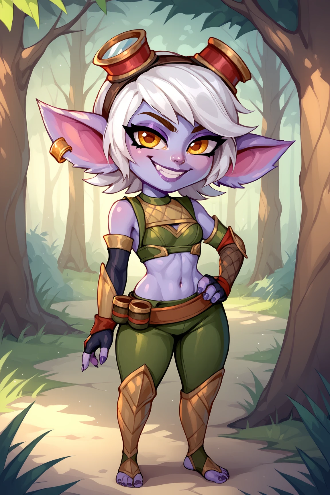 TristanaLoLXLv2, purple skin, colored skin, shortstack, yordle, yellow eyes, white hair, short hair, single earring, googles on head, pointy ears, medium breasts, green midriff, arm sleeves, black gloves, fingerless gloves, elbow gloves, green pants, brown belt, brown legwear, toeless legwear