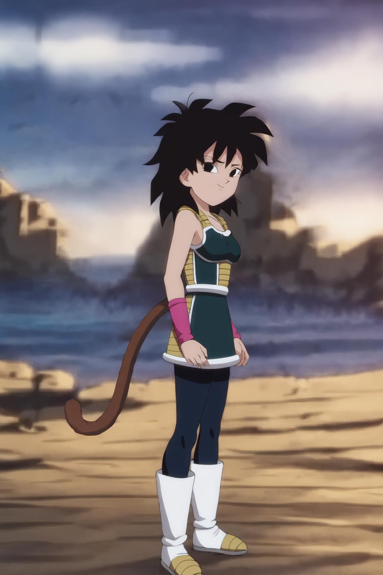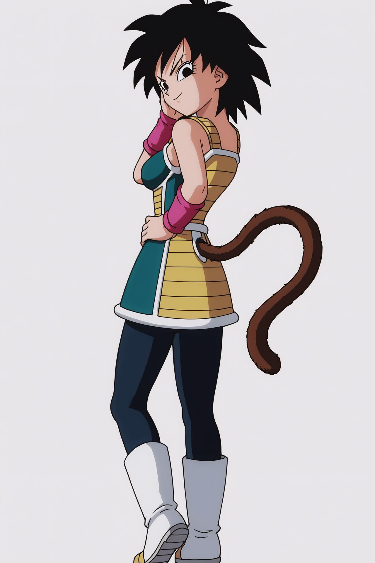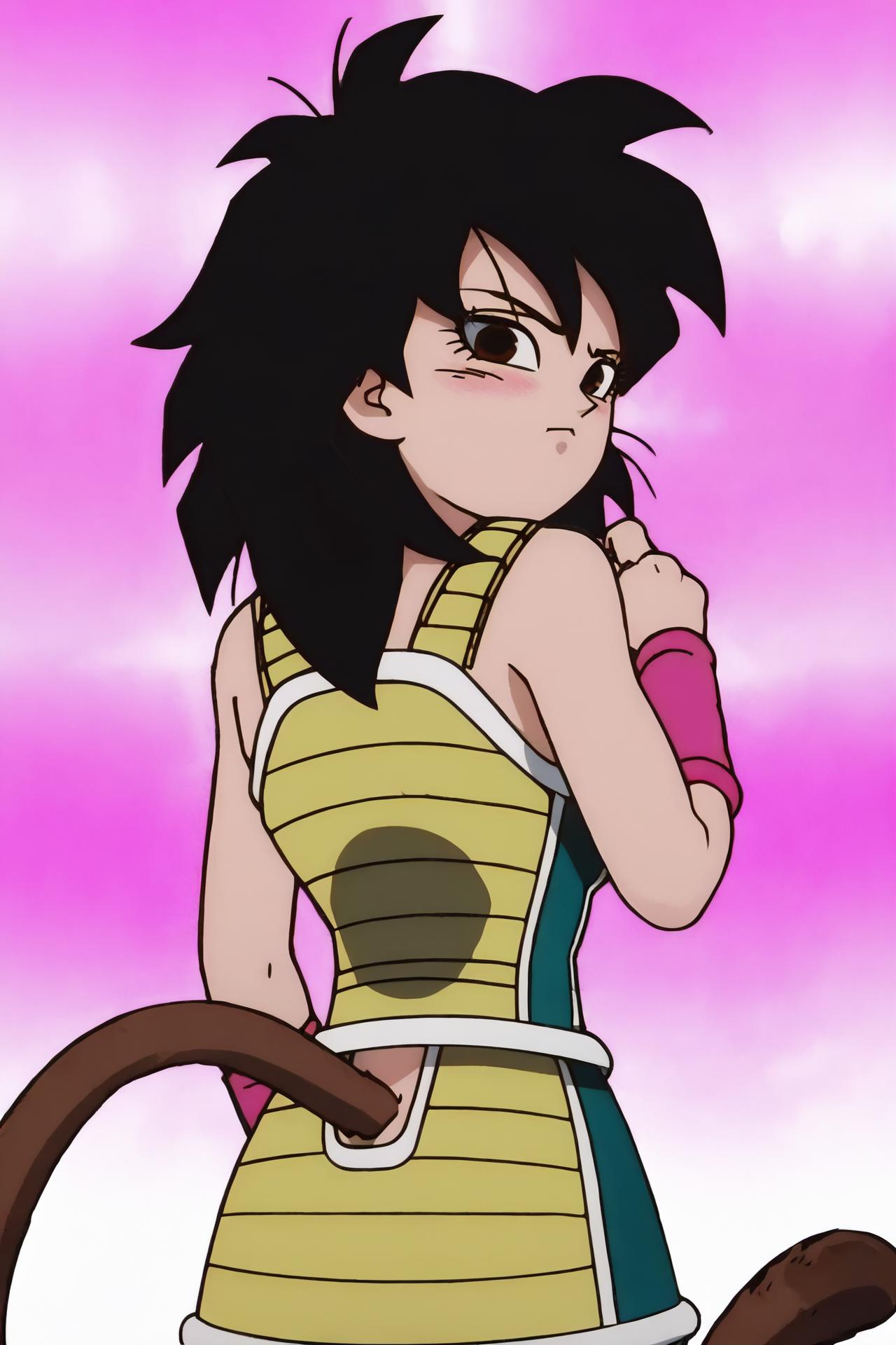 saiyan armor, green saiyan armor, bare shoulders, pink wristband, black pantyhose, boots,