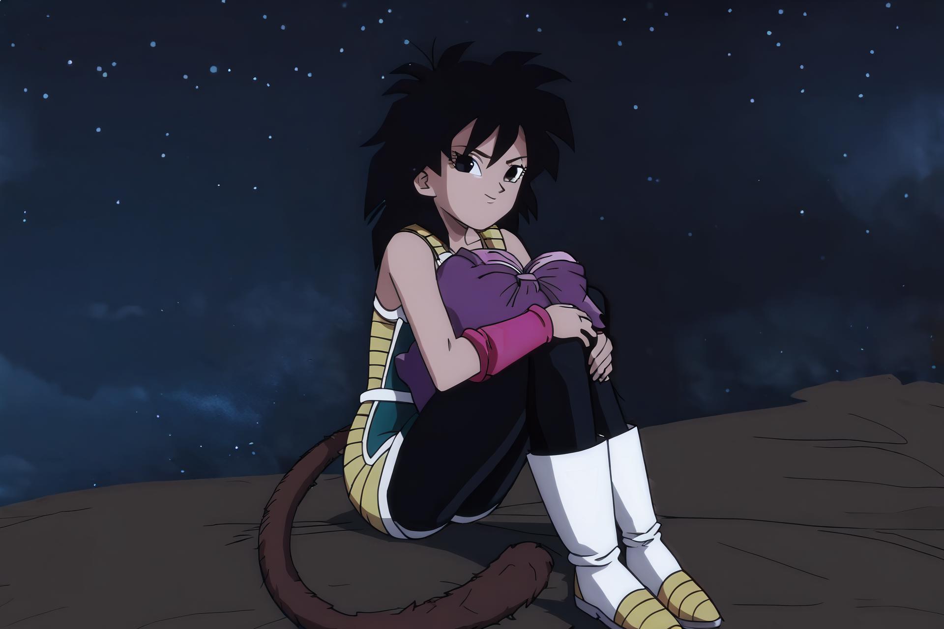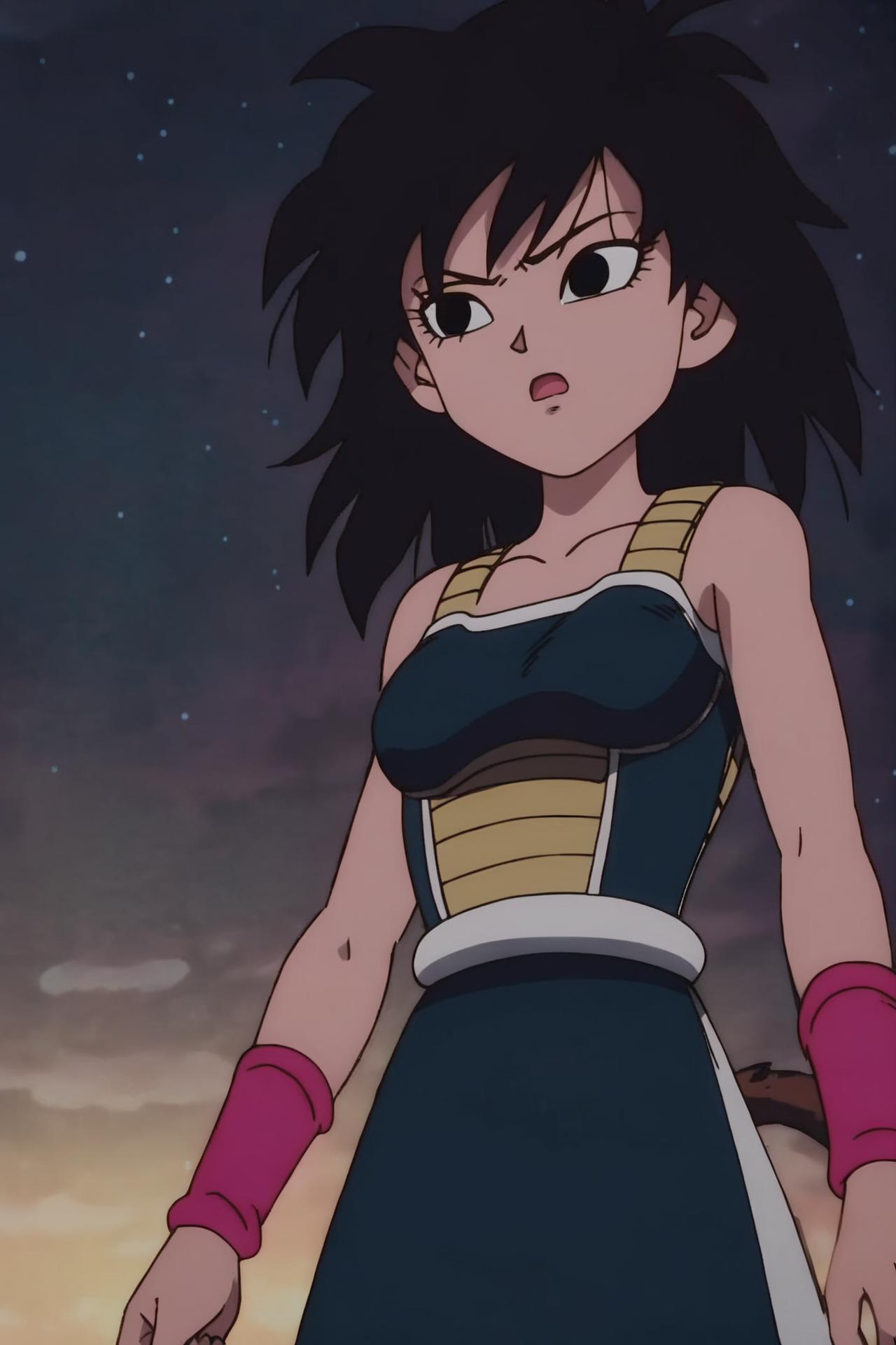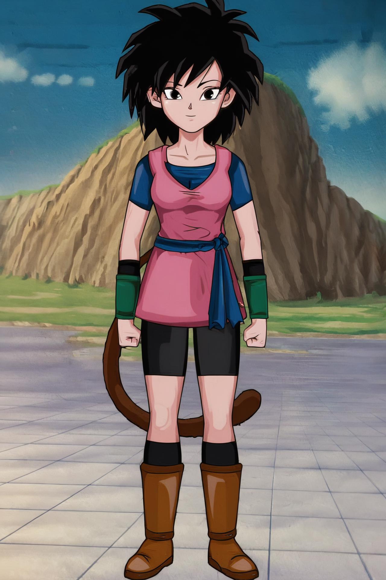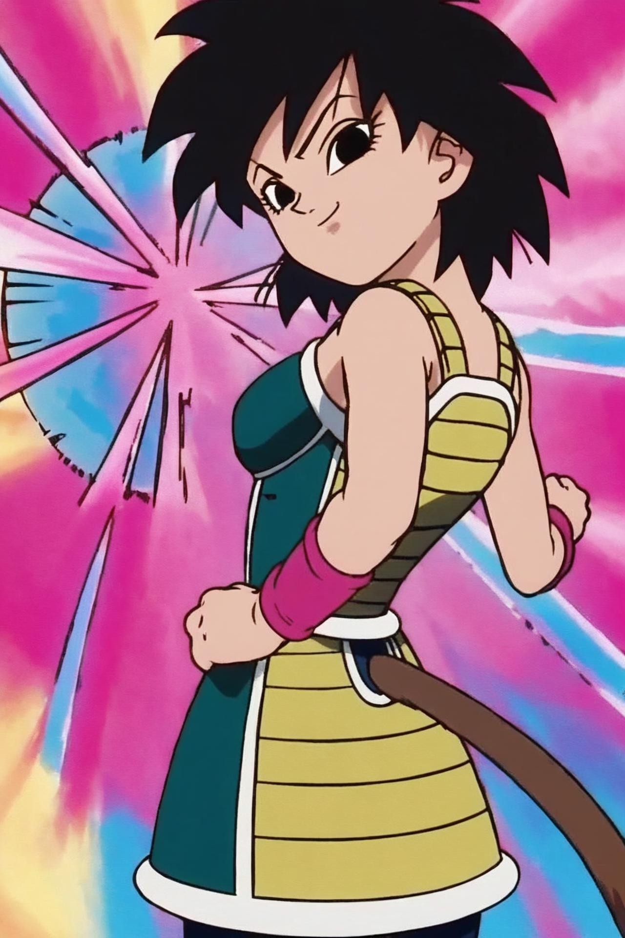 saiyan armor, green saiyan armor, bare shoulders, pink wristband, black pantyhose, boots,