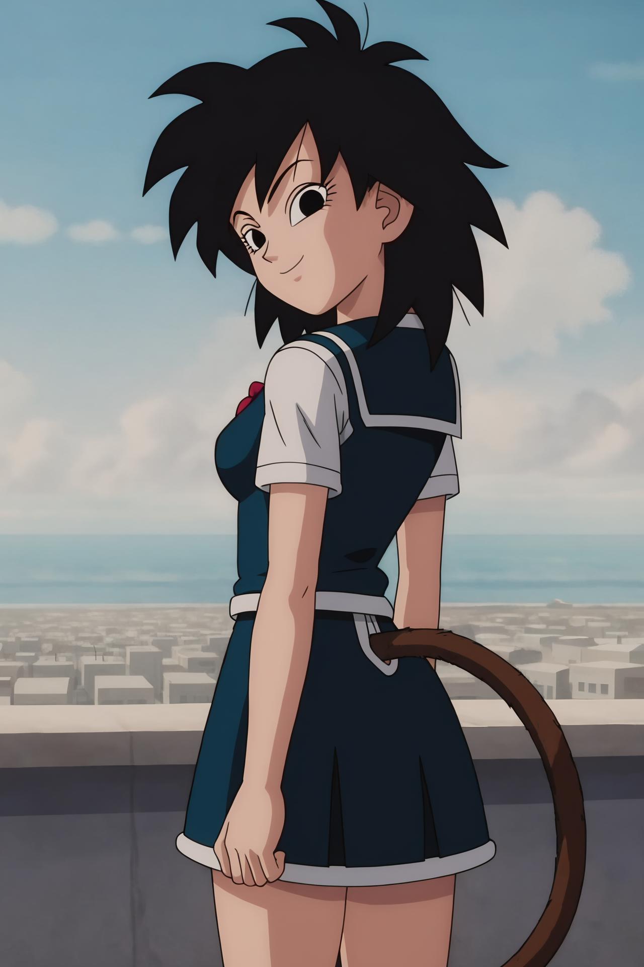 black eyes, black hair, medium hair, spiked hair, monkey tail,
