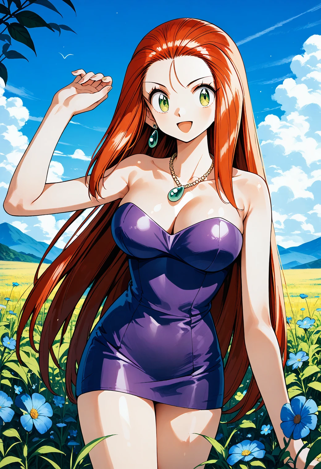 mikami_reiko, green eyes, red hair, long hair, forehead, earrings, necklace, cleavage, bare arms, purple dress, short dress, strapless dress, tube dress,
