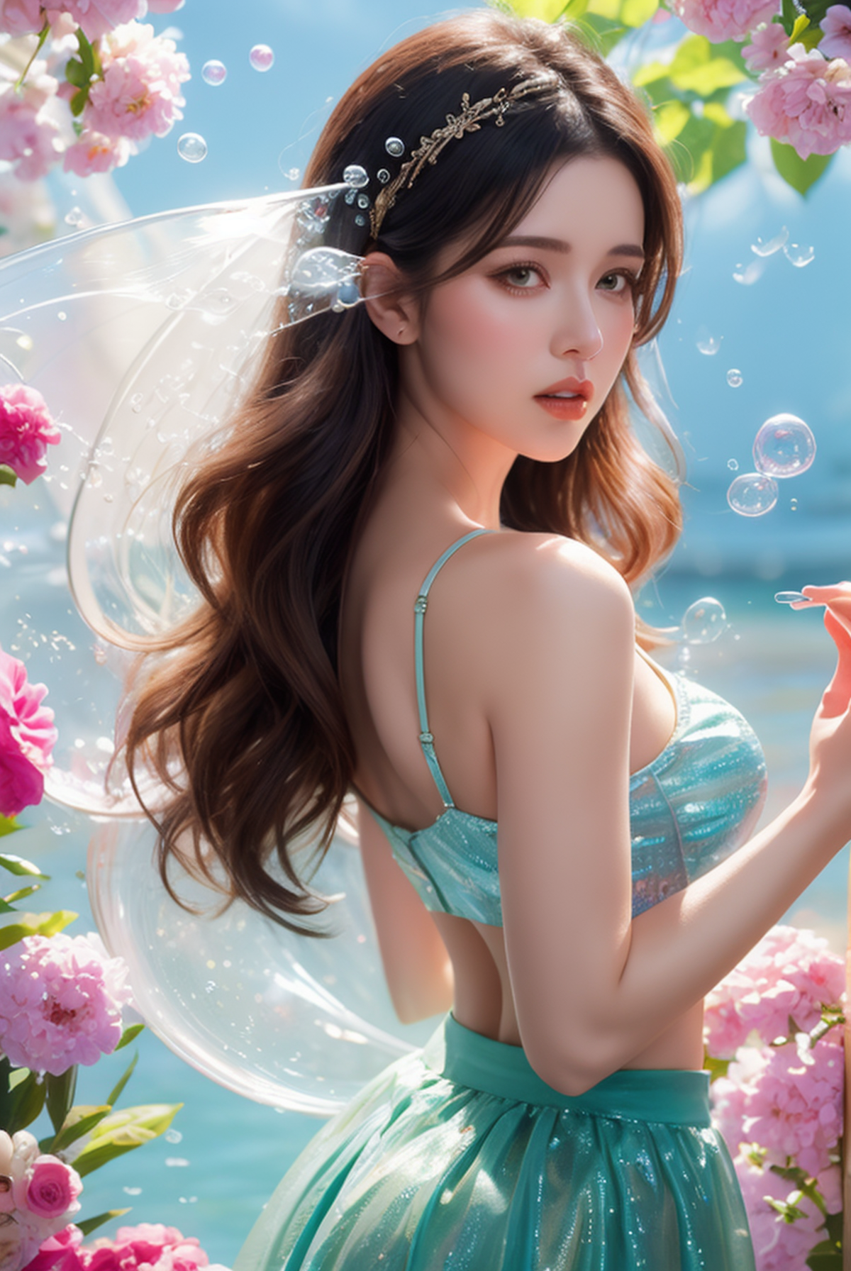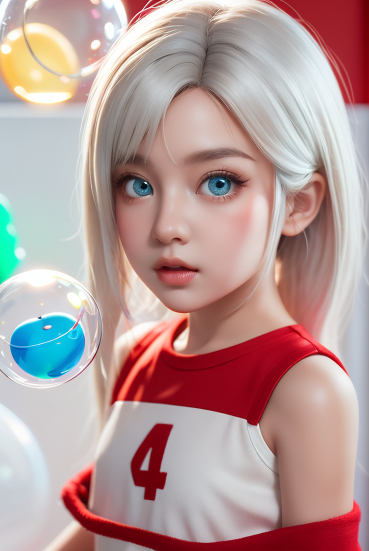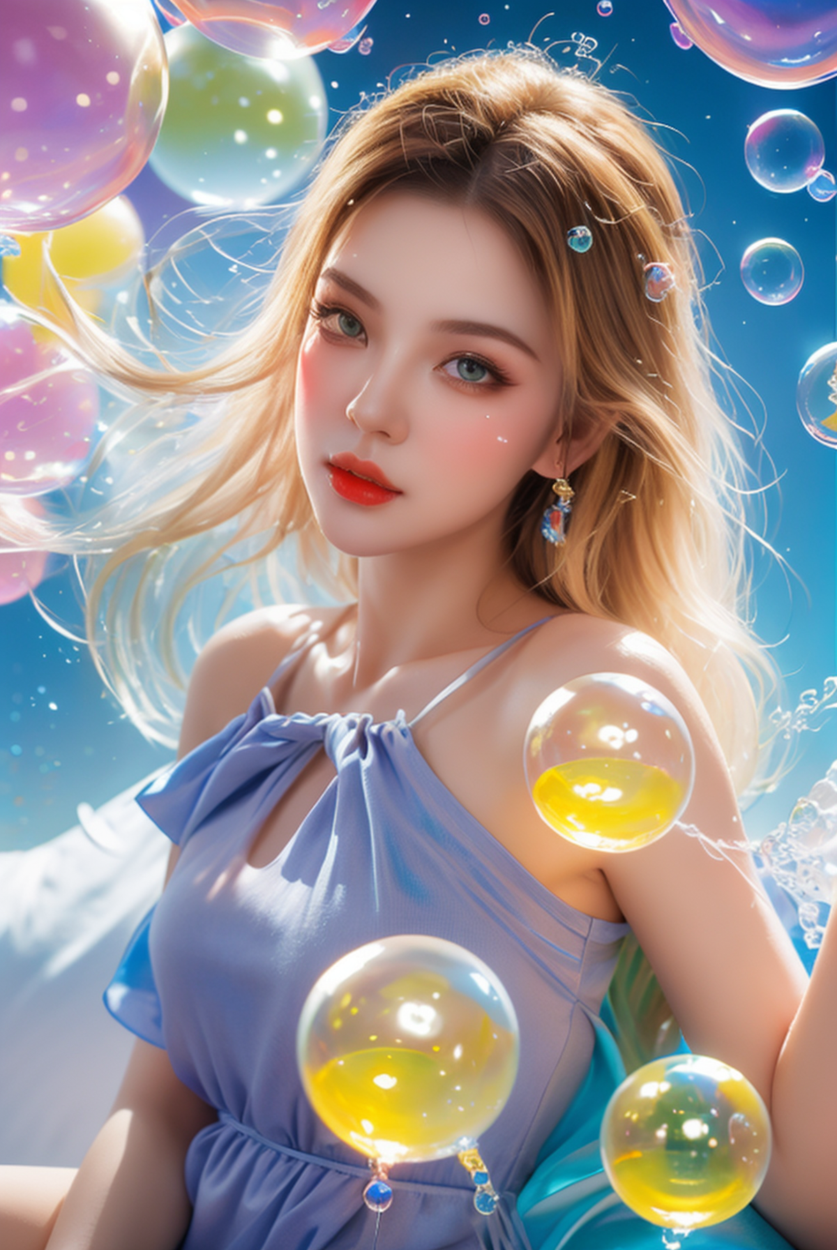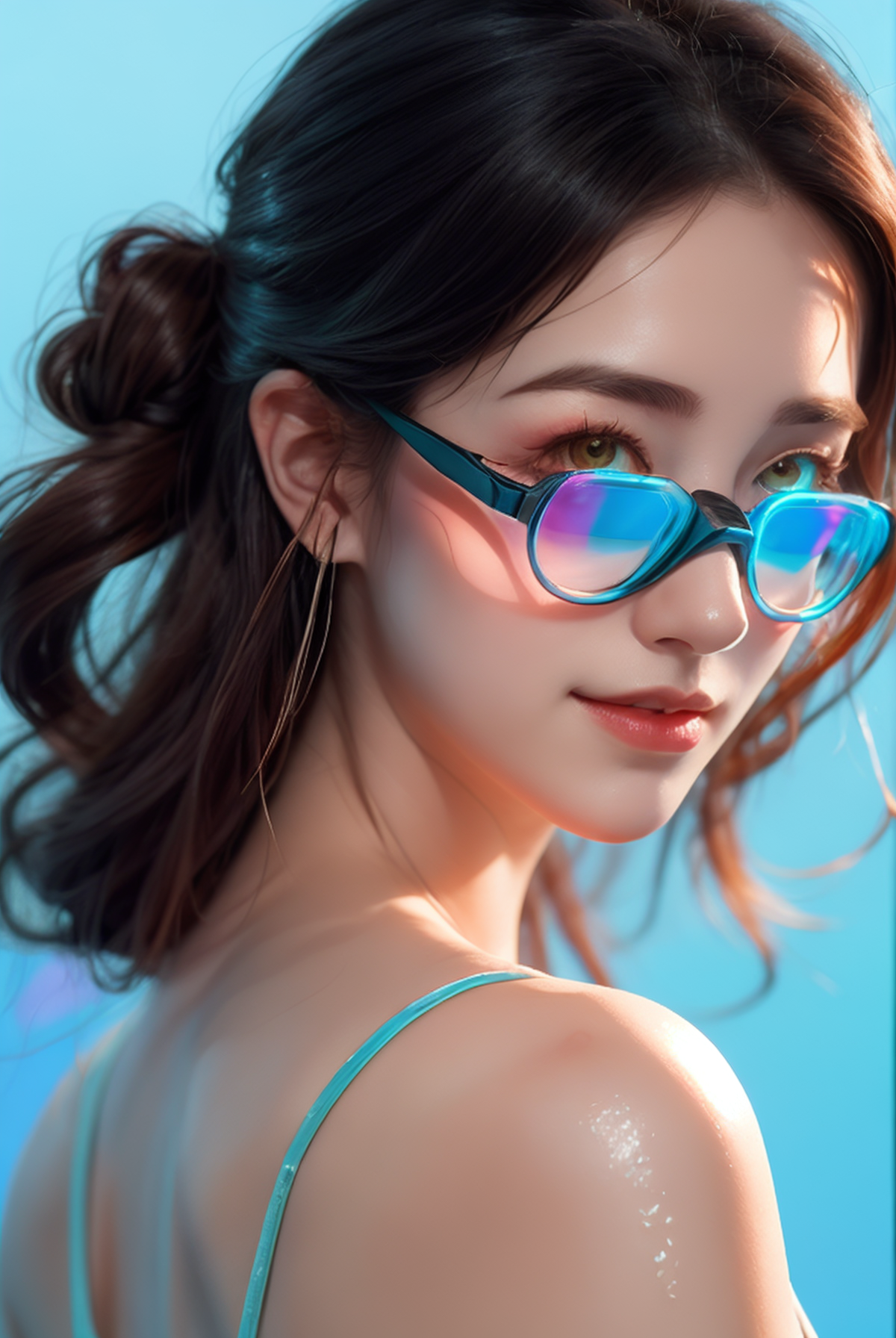 Pouting,kissing,closing one eye,imitating the style of Abigail Larson (Abigail Larson),beautiful details,girls swimming underwater,diving,Oyo Keyang style,in a actual hyper detailed render style,smile,glow,blue,ZBrush,diving glasses,hyper actual oil,head close-up,exaggerated color,holographic effect,Tyndall mother-of-pearl,white,blue background,actual,
