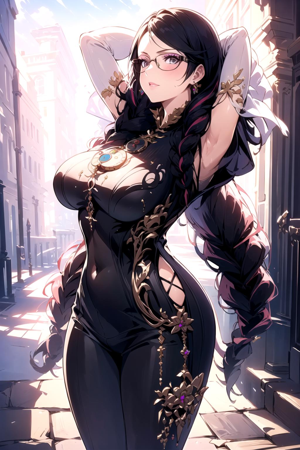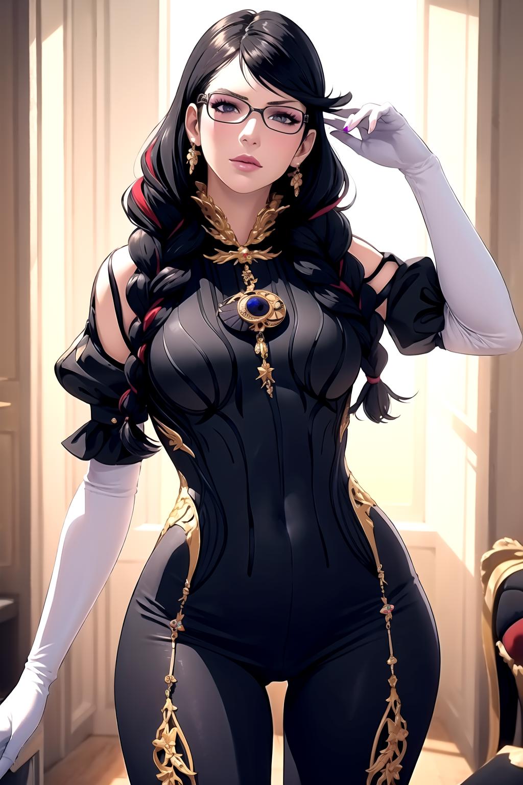 bayonetta3, 1girl, long hair, glasses, makeup, twin braids, lipstick, jewelry, elbow gloves, bodysuit