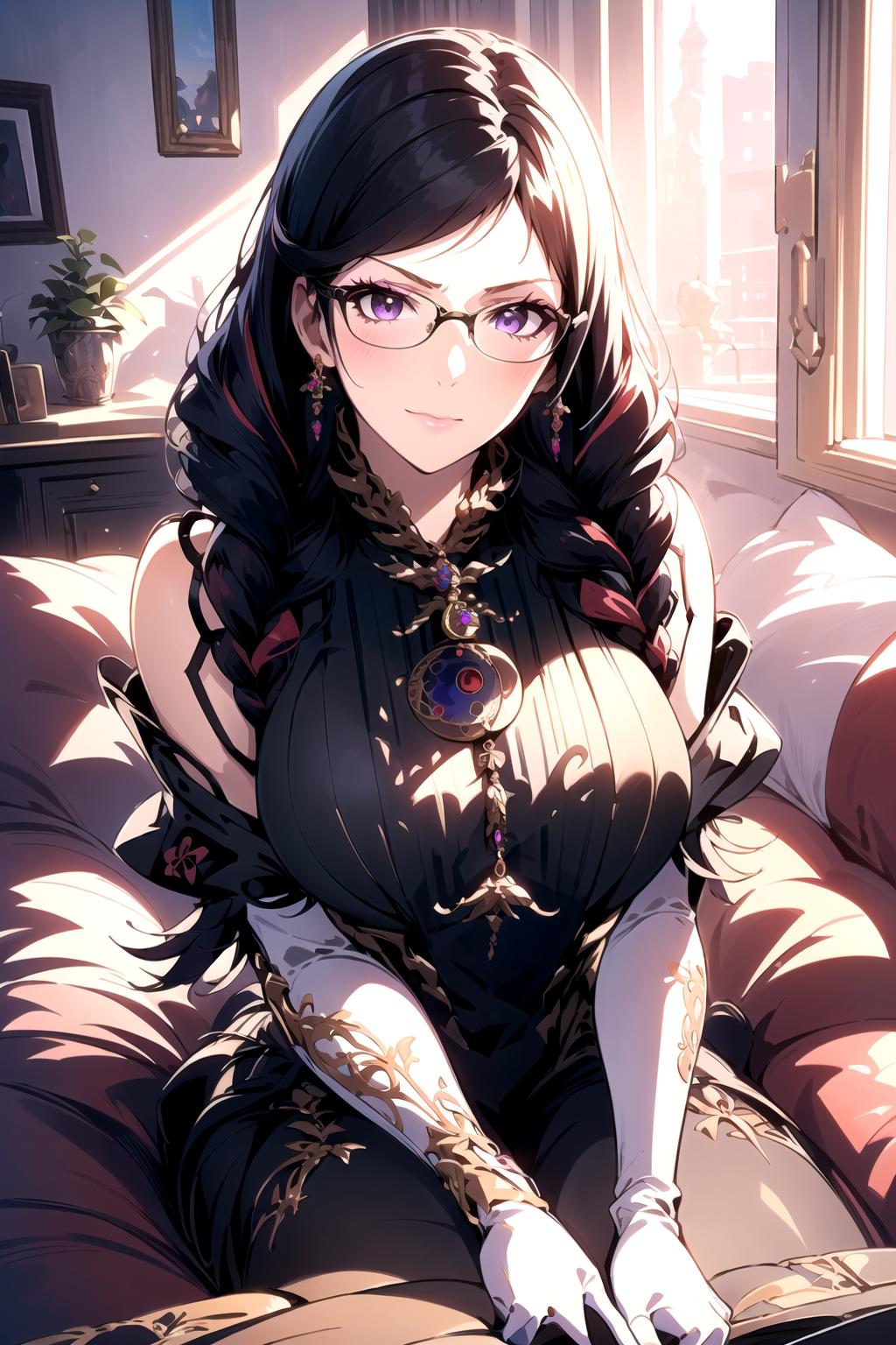 bayonetta1, 1girl, ????????, cleavage cutout, elbow gloves, makeup, jewelry, lipstick, hair ribbon, glasses