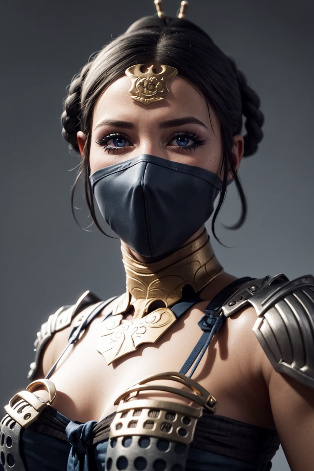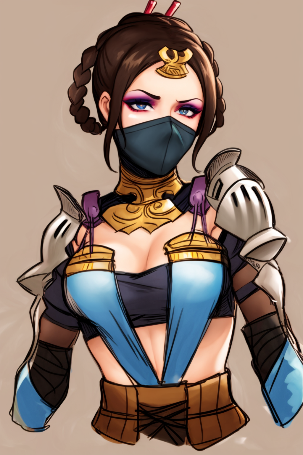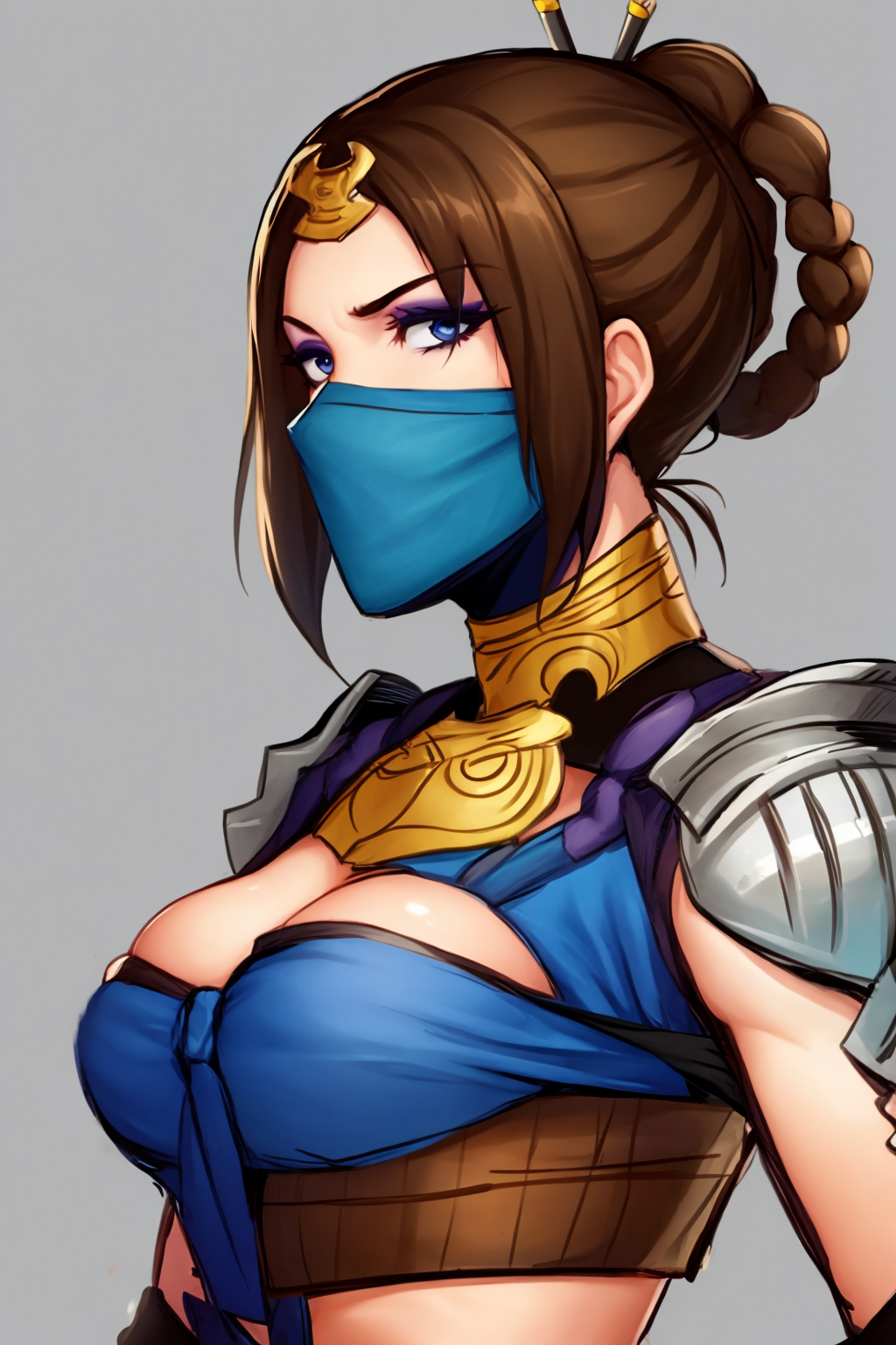 Other prompts : black hair, hair bun, brown eyes, mouth mask, elbow gloves, cleavage cutout, armor, shoulder armor, dark skin, clothing cutout, ninja