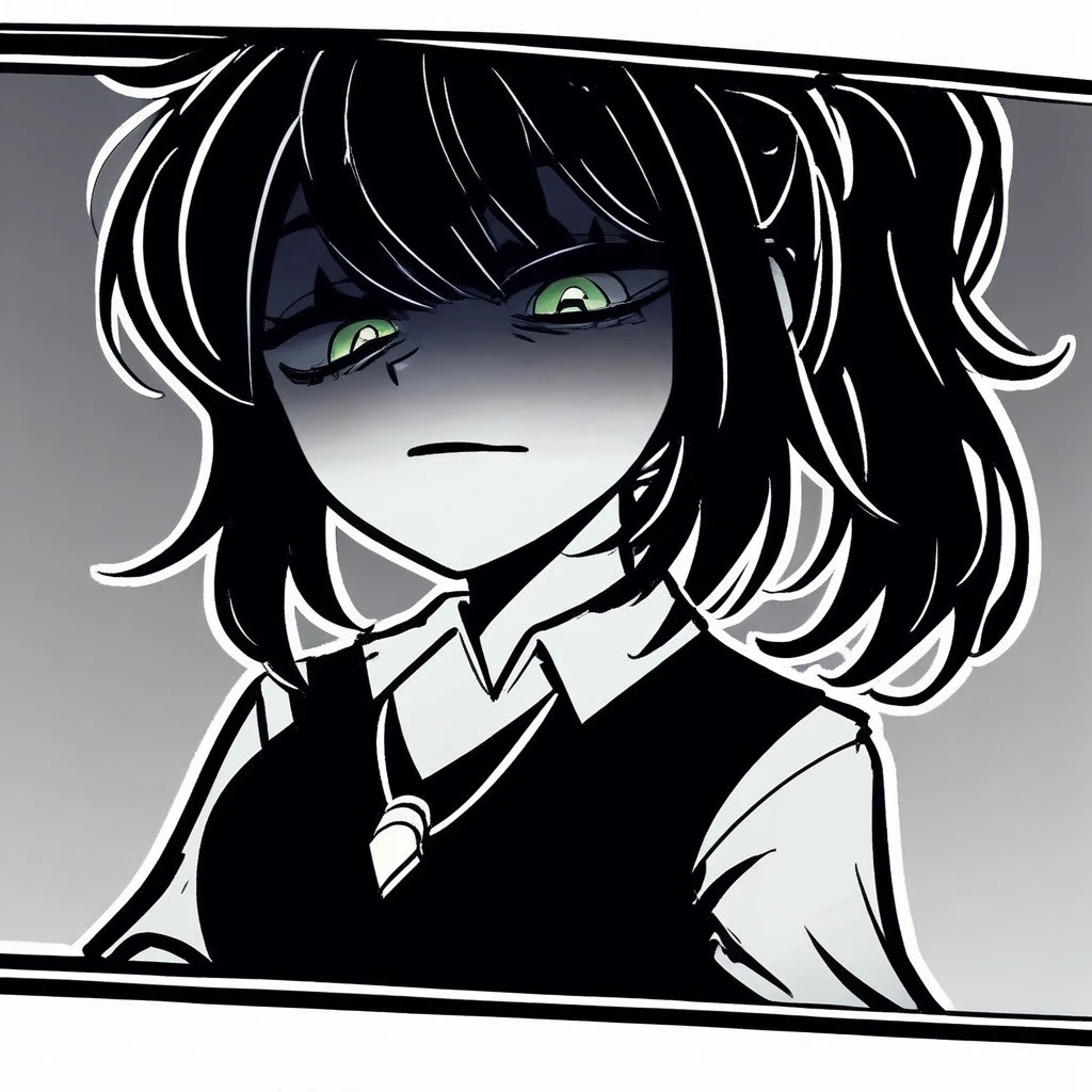 Mrs. Graves, black hair, ponytail, sidelocks, green eyes, black hair,