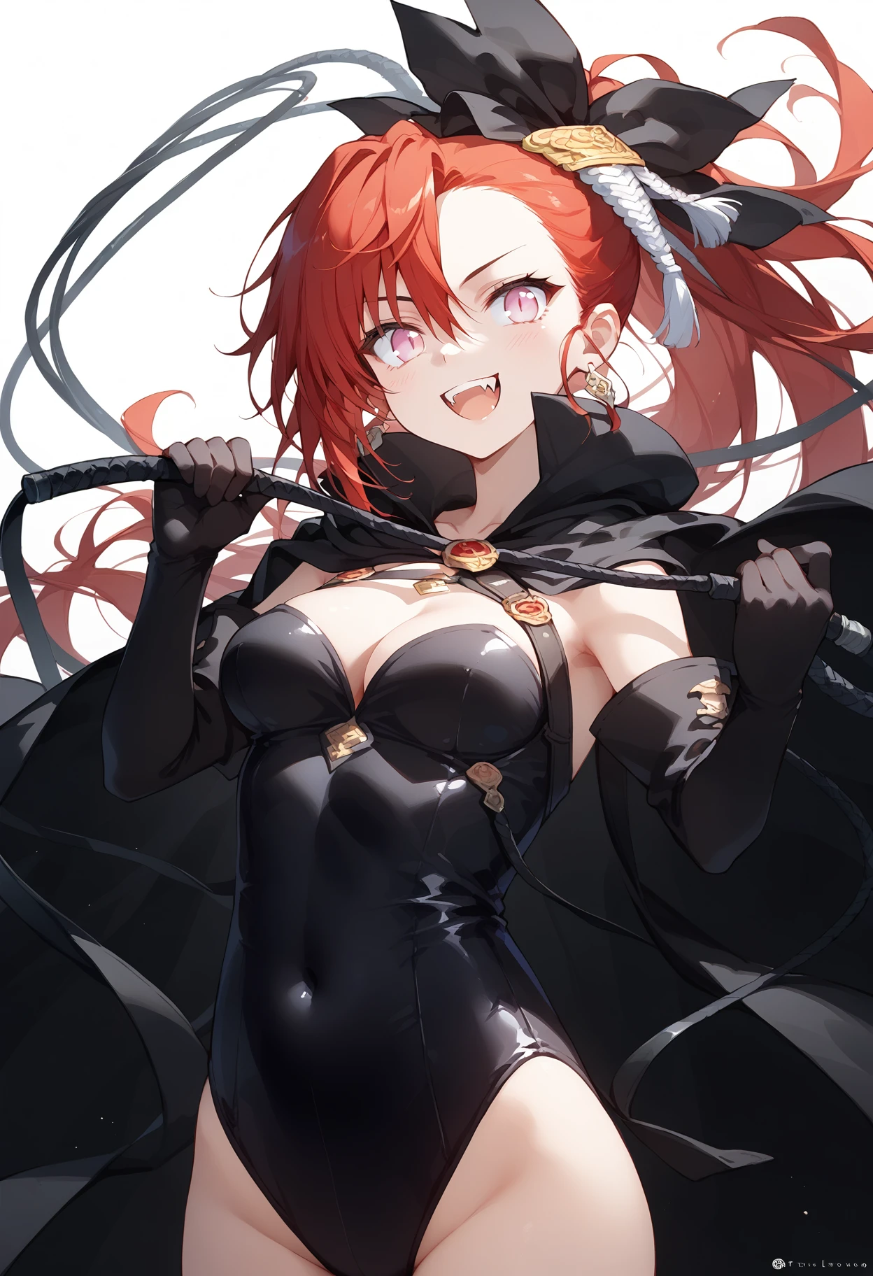 Trigger words: satella, 1girl, long hair, red hair, ponytail, pink eyes, hair ornament, solo, black elbow gloves, black cape, black leotard, ??????????????, cleavage, thighhighs, thigh boots