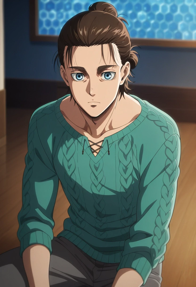 eren_yeager_s4, brown hair, blue eyes, short hair, hair bun, single hair bun