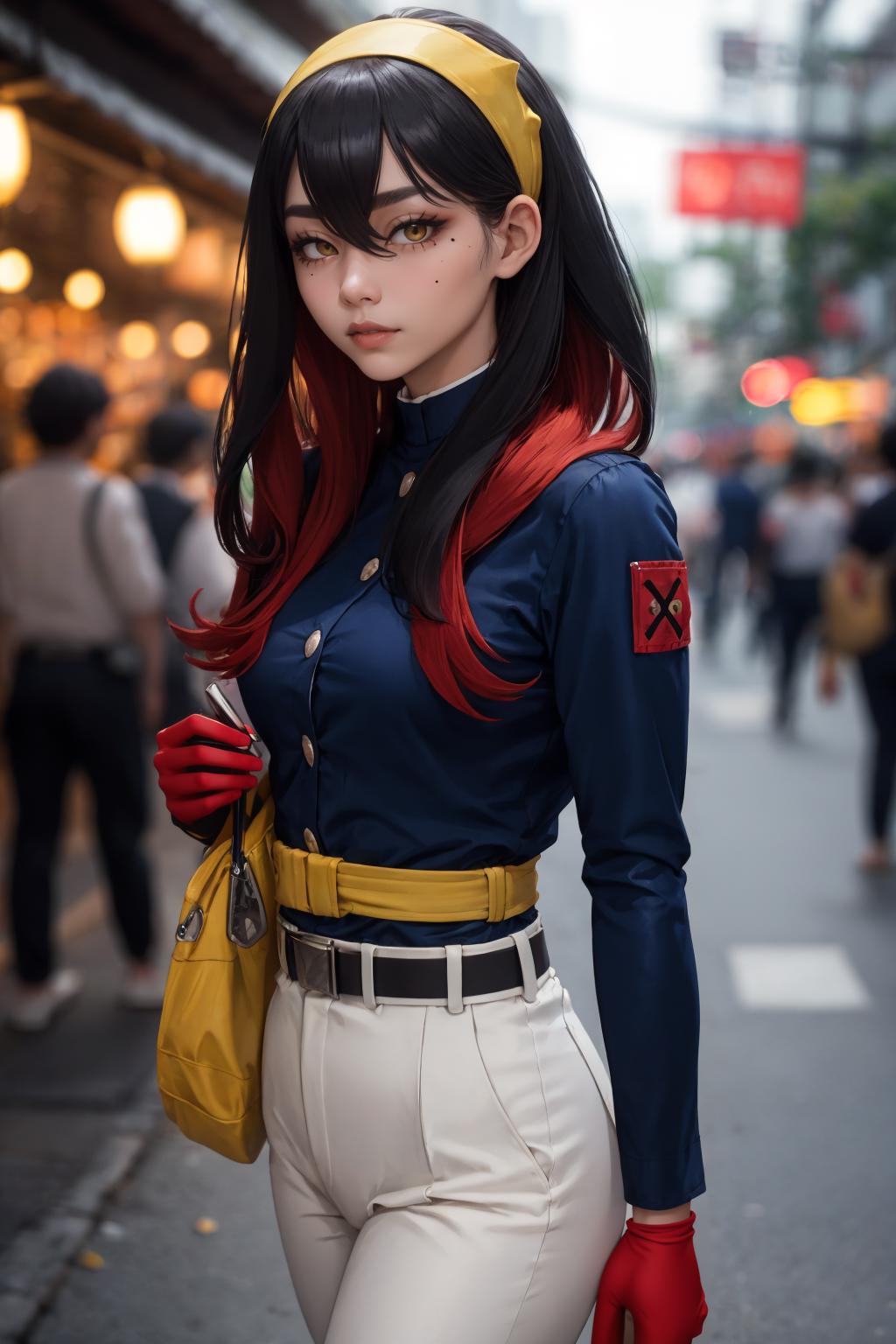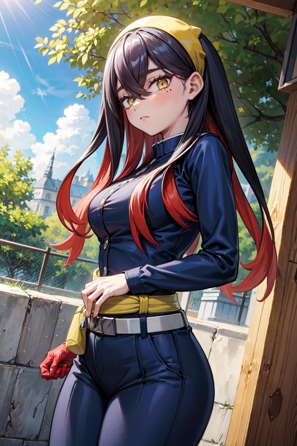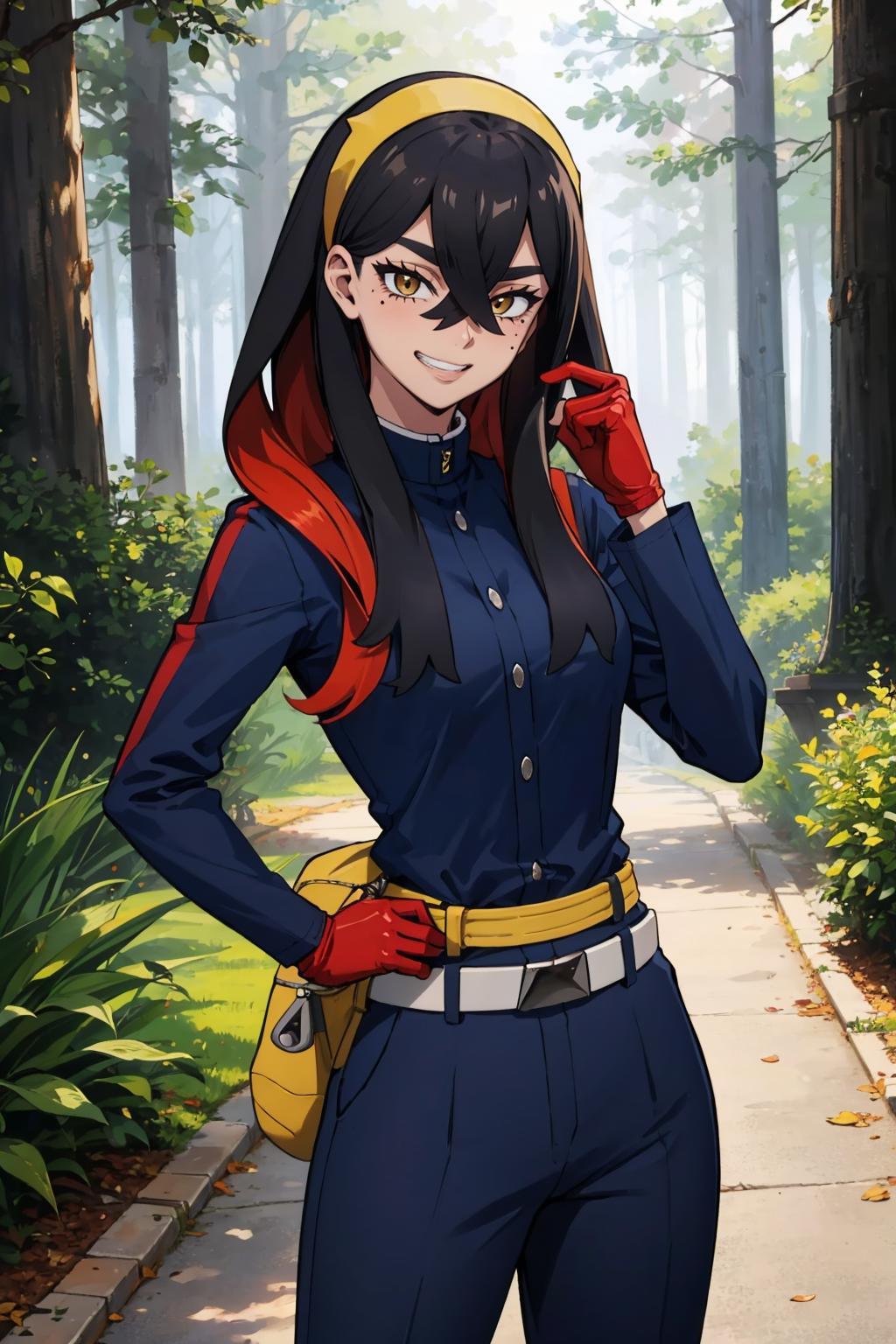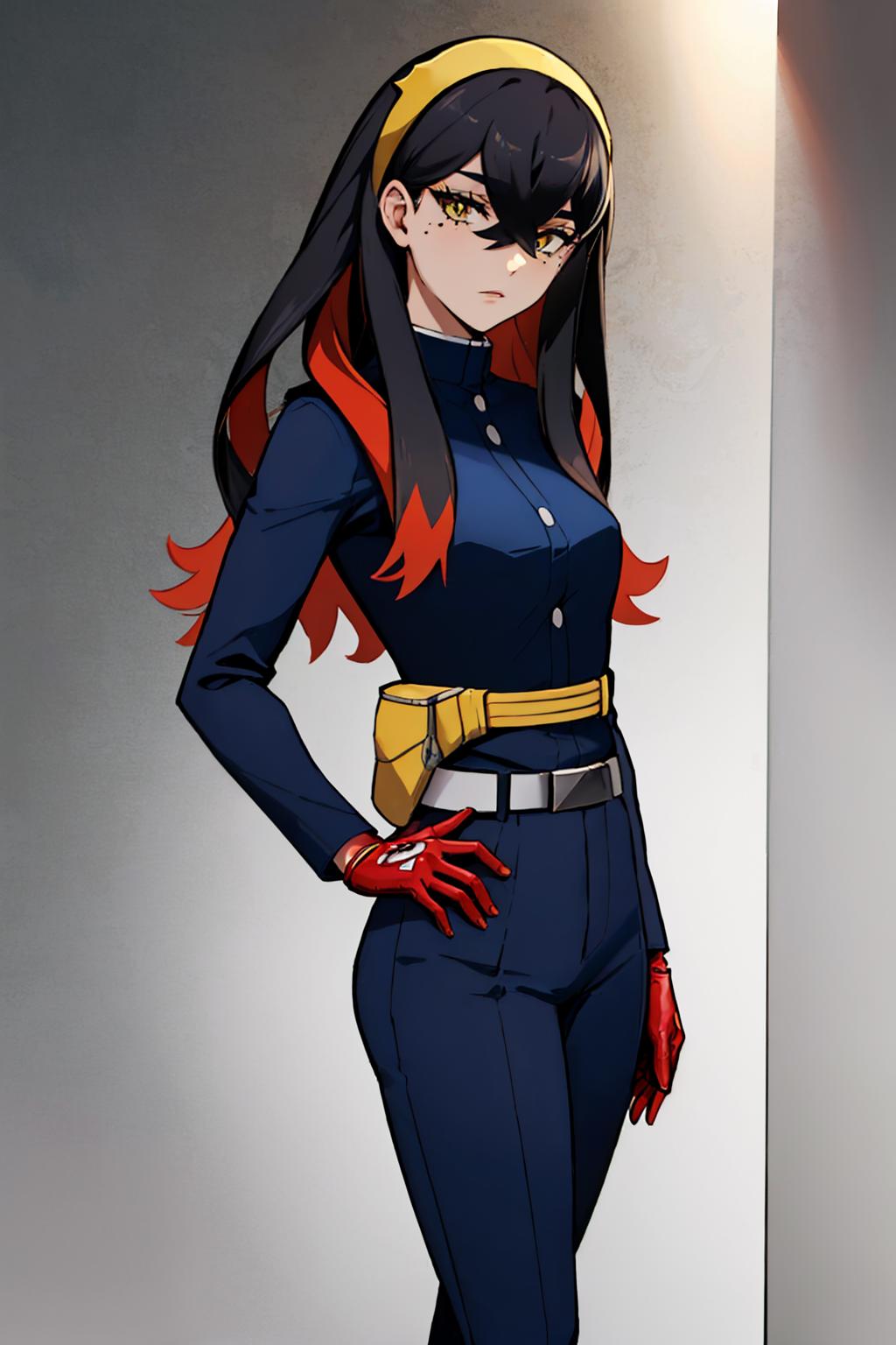 Default Outfit: hairband, blue jacket, long sleeves, red gloves, pants, belt