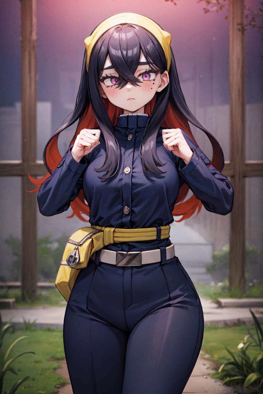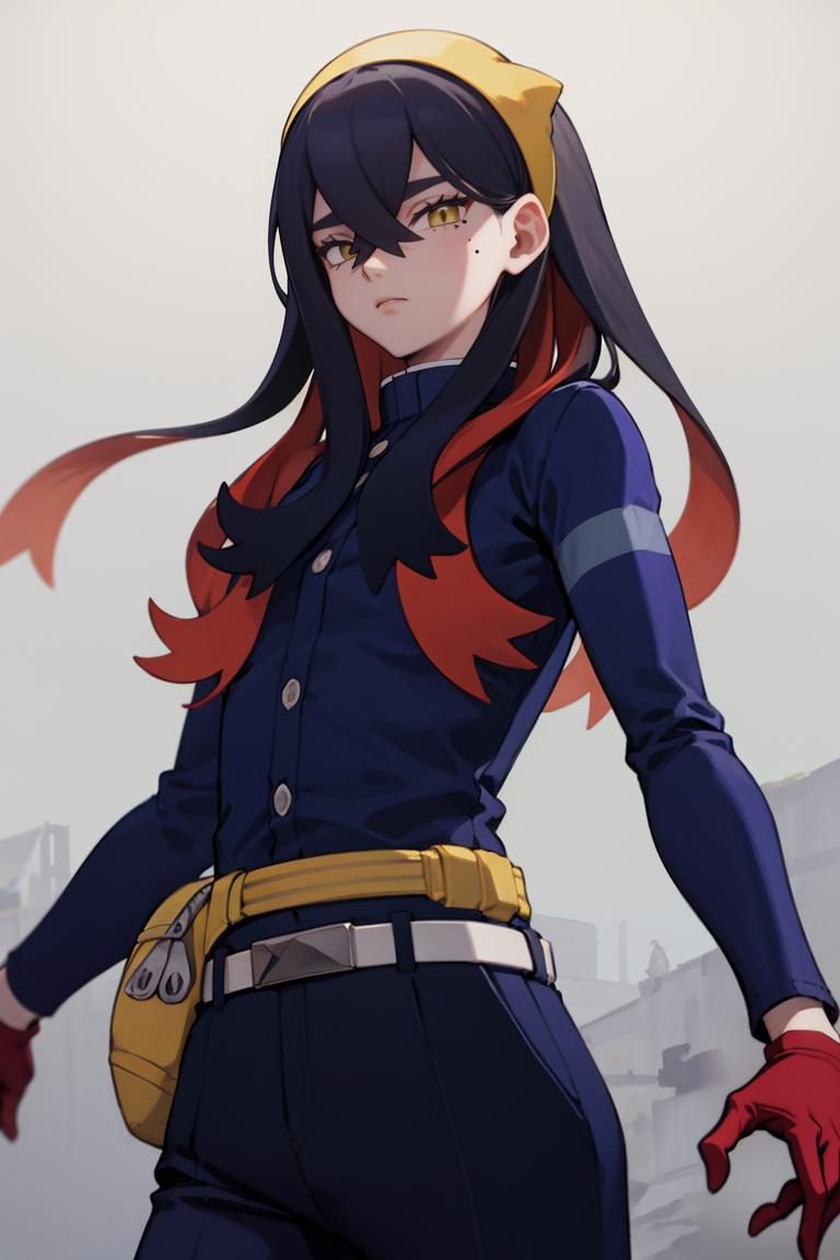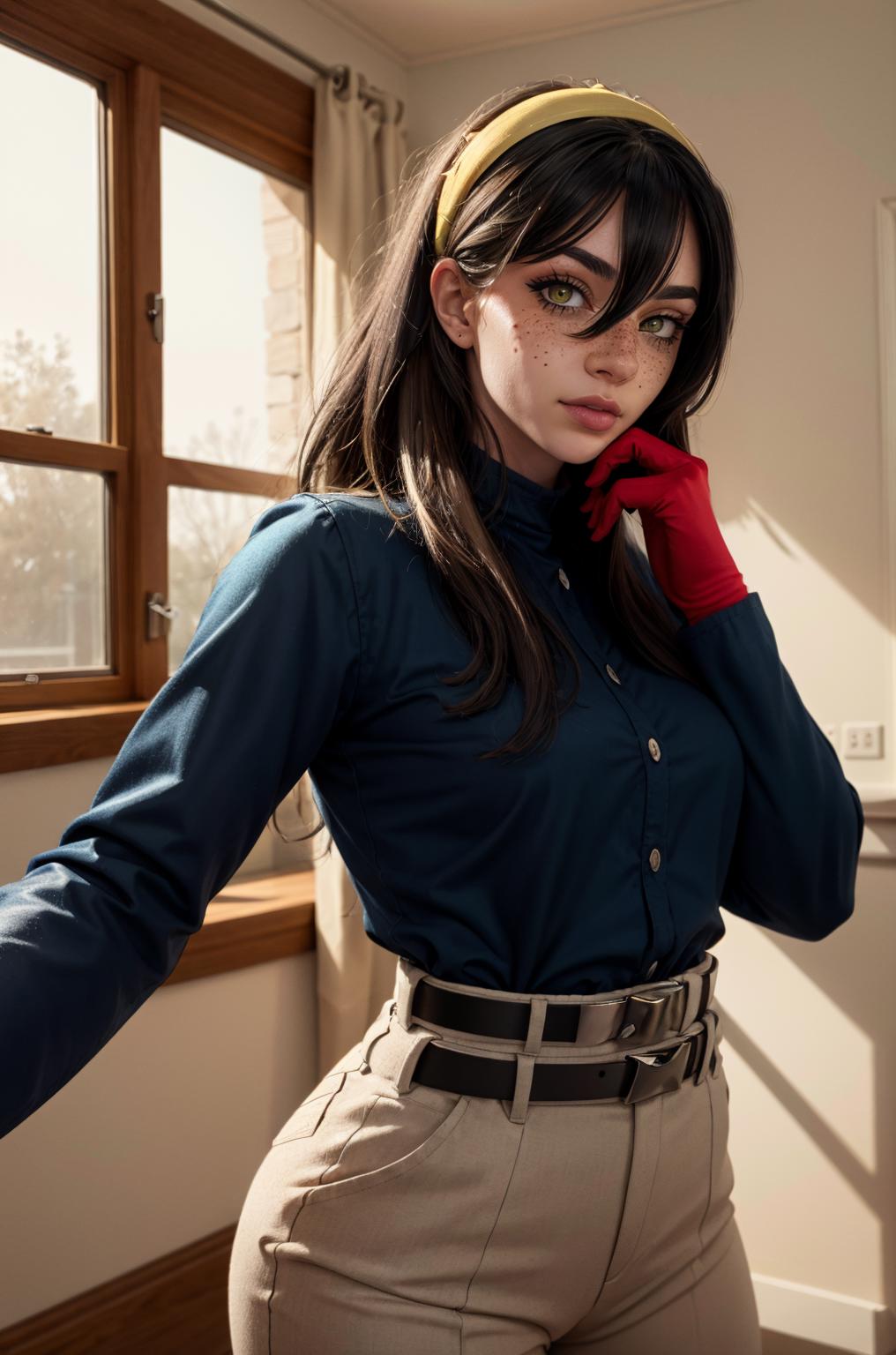 Default Outfit: hairband, blue jacket, long sleeves, red gloves, pants, belt